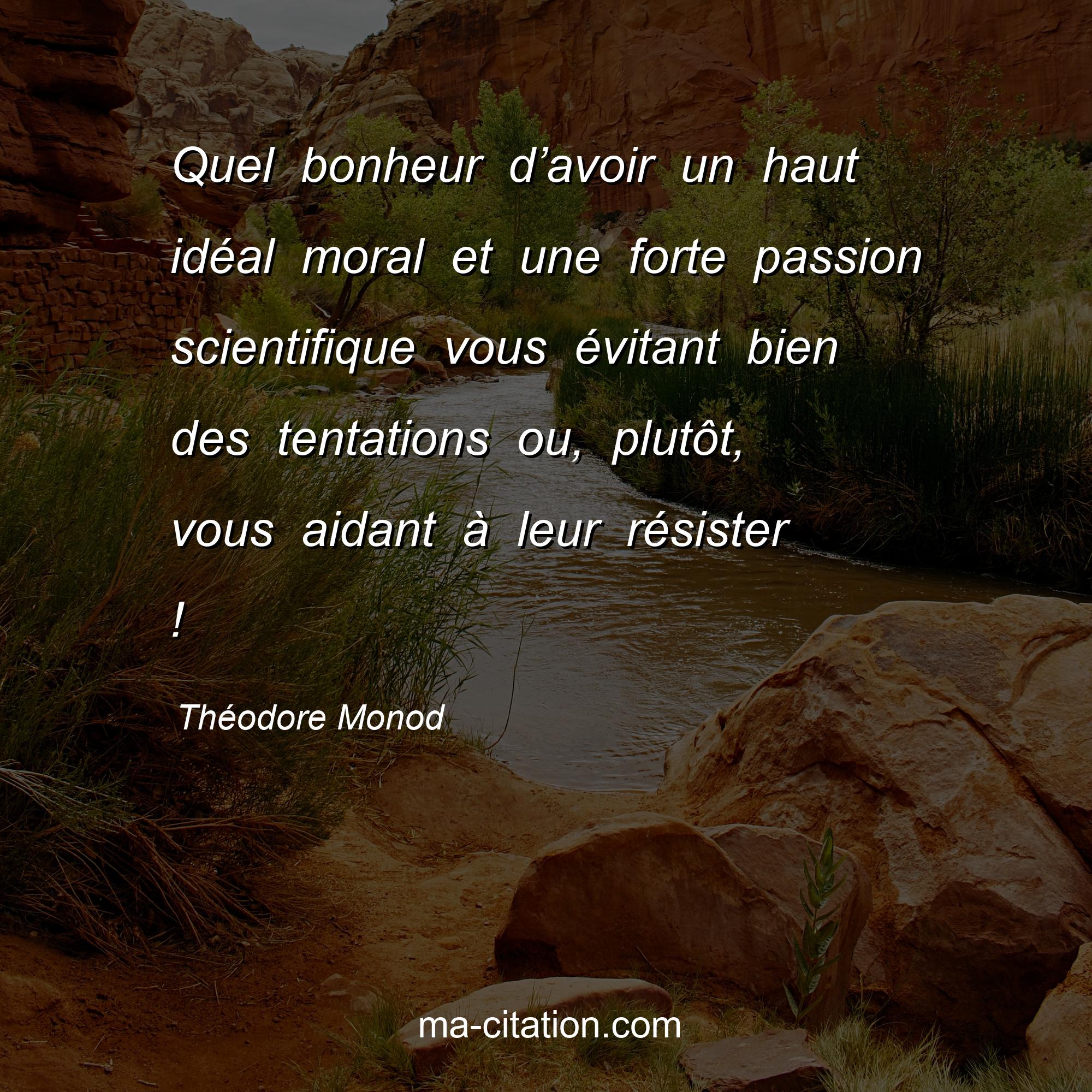 Citation sur la vie de Théodore Monod :Quel bonheur d’avoir un haut idéal moral et une forte passion scientifique vous évitant bien des tentations ou, plutôt, vous aidant à leur résister !
