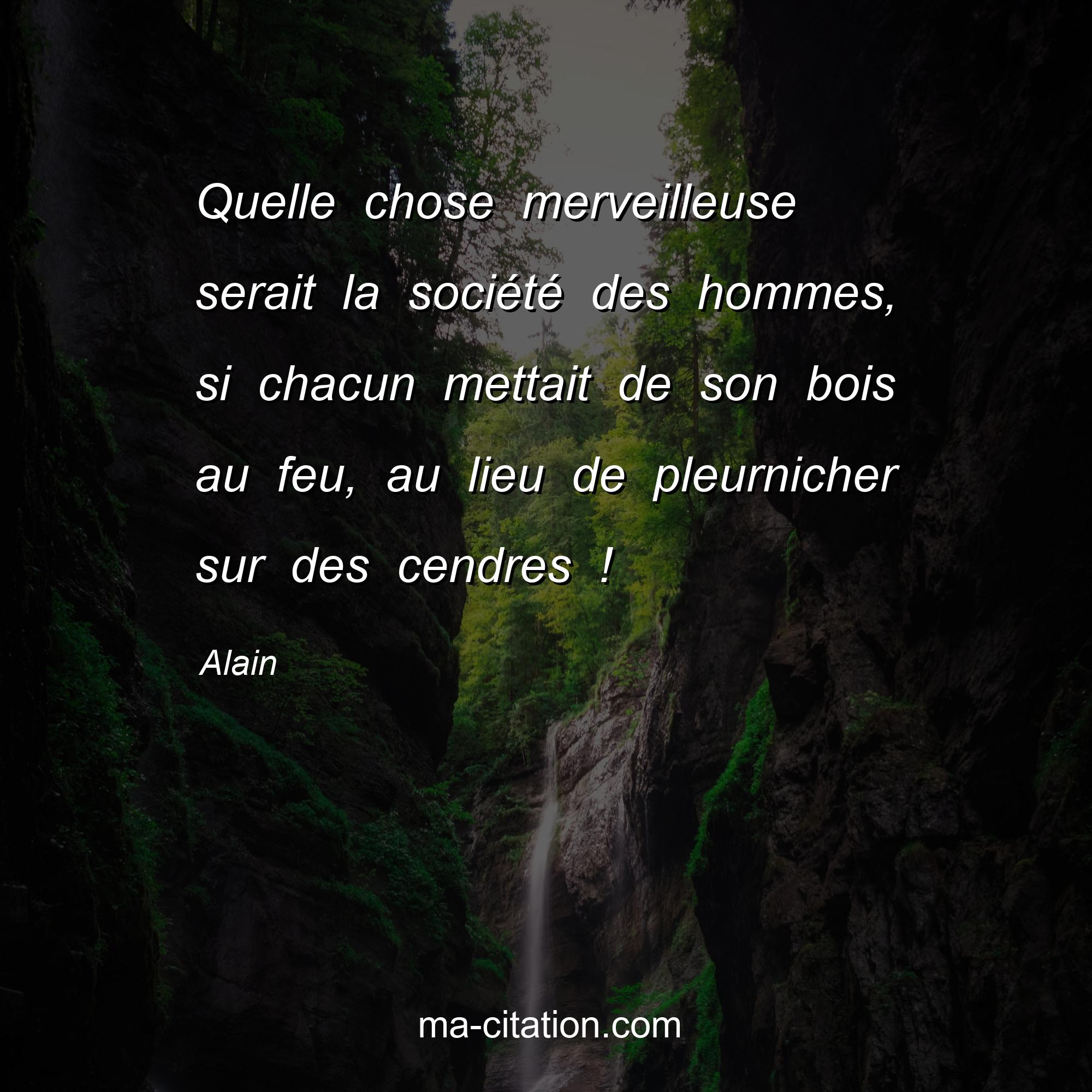 Citation sur la vie d'Alain :Quelle chose merveilleuse serait la société des hommes, si chacun mettait de son bois au feu, au lieu de pleurnicher sur des cendres !