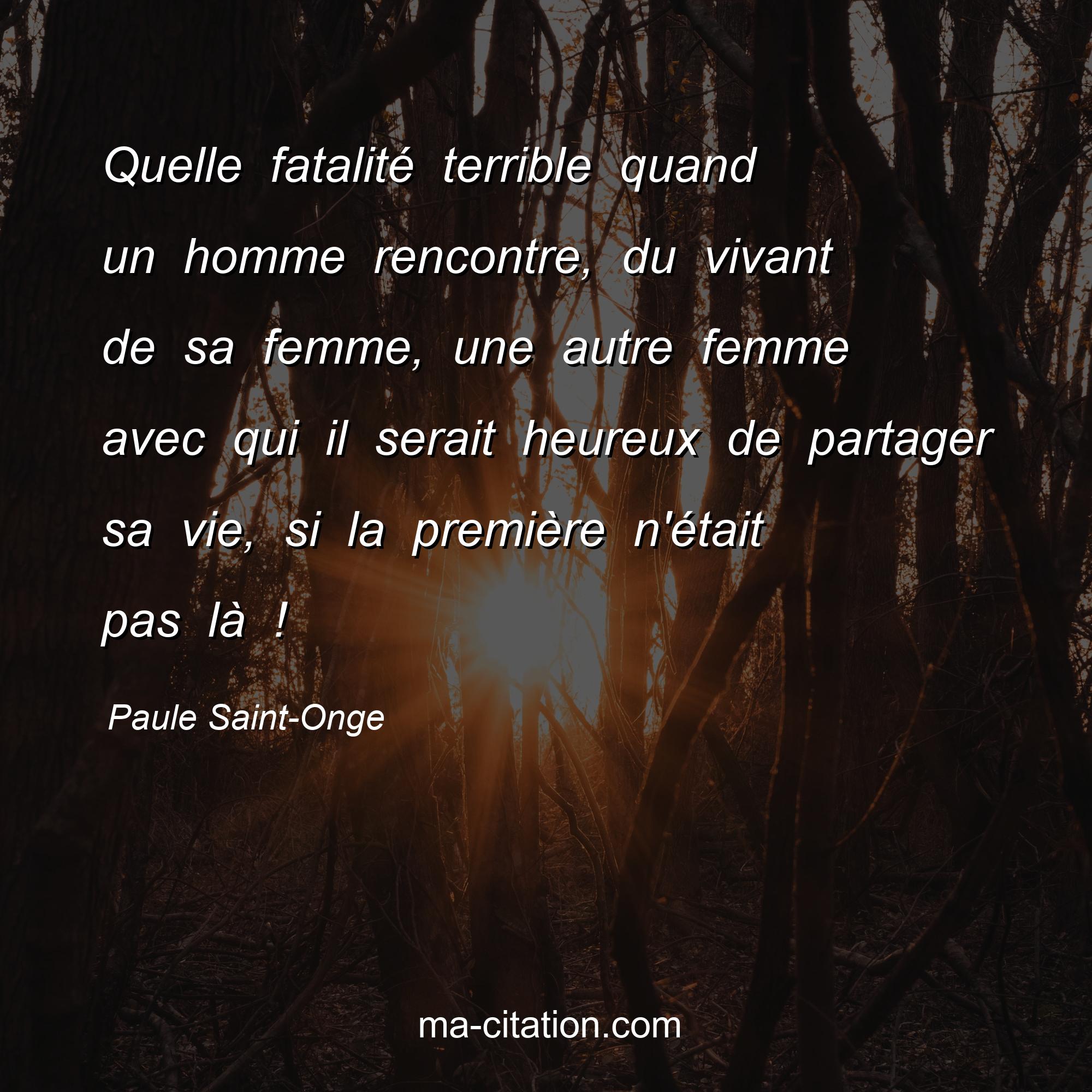 Citation sur la vie de Paule Saint-Onge :Quelle fatalité terrible quand un homme rencontre, du vivant de sa femme, une autre femme avec qui il serait heureux de partager sa vie, si la première n'était pas là !