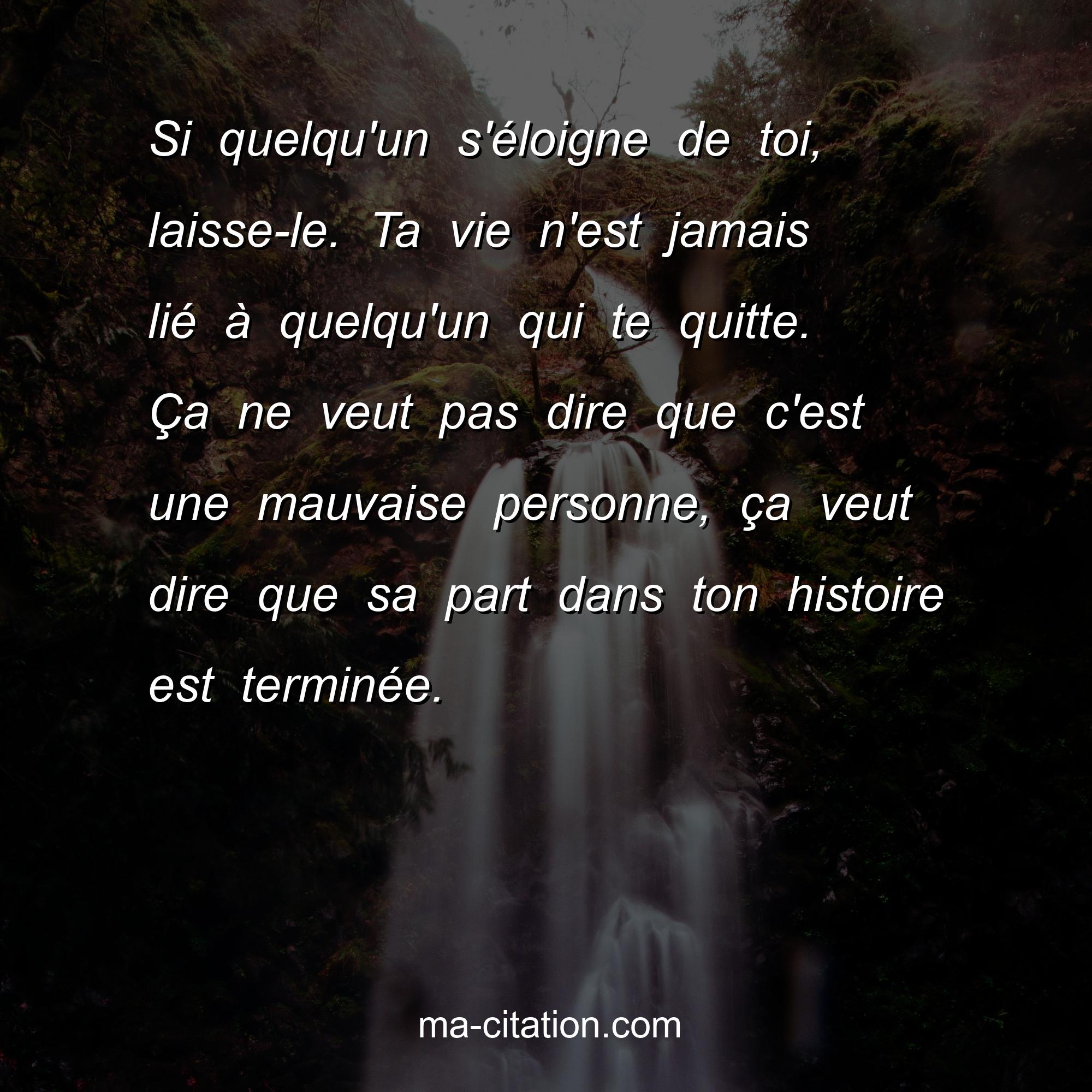 Si quelqu'un s'éloigne de toi, laisse-le. Ta vie n'est jamais lié à quelqu'un qui te quitte. Ça ne veut pas dire que c'est une mauvaise personne, ça veut dire que sa part dans ton histoire est terminée.