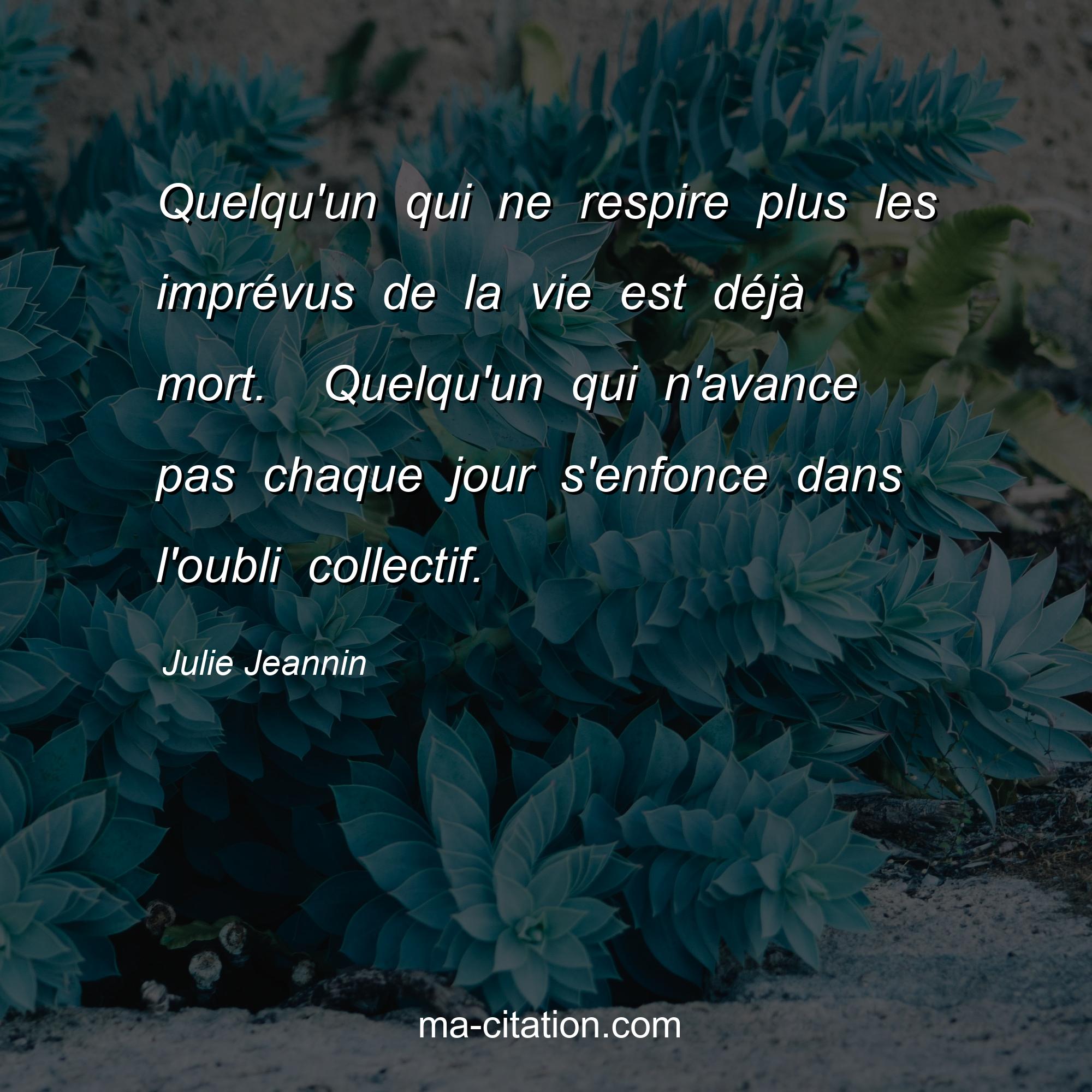 Julie Jeannin est l'auteur de la citation sur la vie "Quelqu'un qui ne respire plus les imprévus de la vie est déjà mort. Quelqu'un qui n'avance pas chaque jour s'enfonce dans l'oubli collectif.".