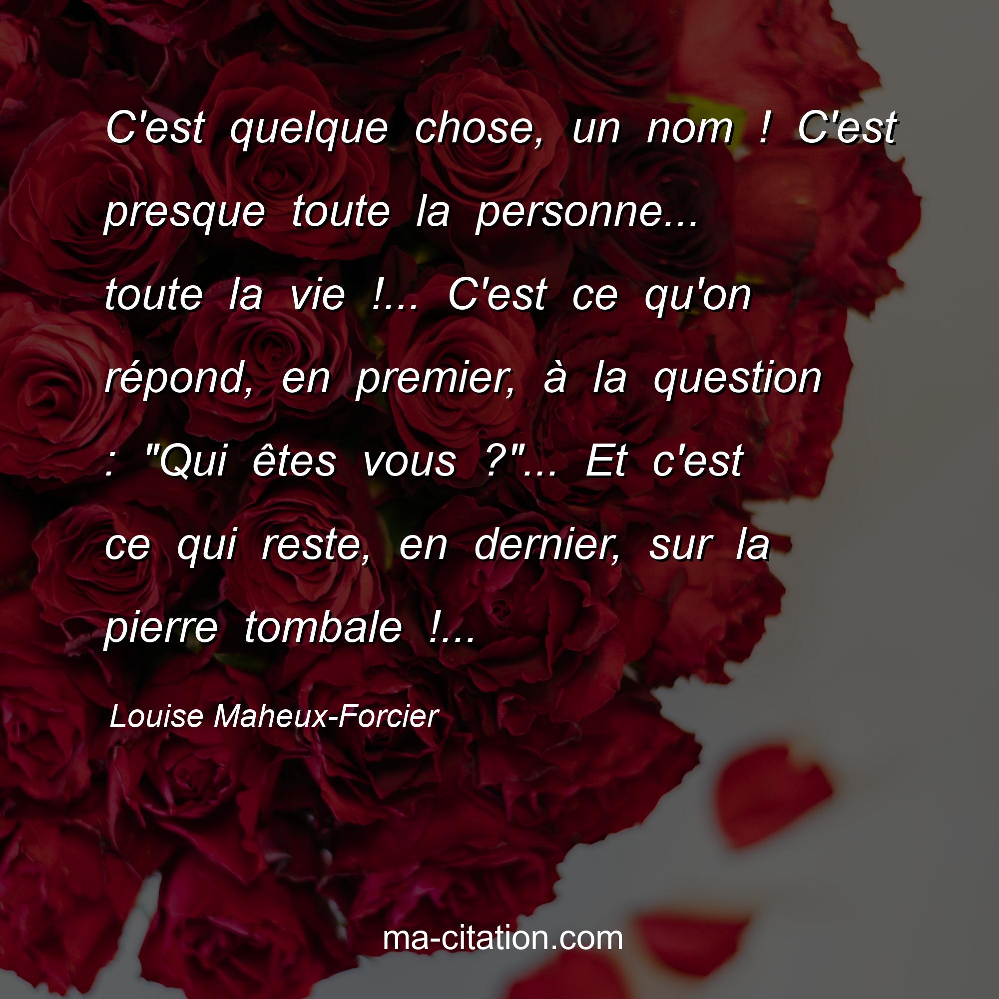Citation sur la vie de Louise Maheux-Forcier :C'est quelque chose, un nom ! C'est presque toute la personne... toute la vie !... C'est ce qu'on répond, en premier, à la question : "Qui êtes vous ?"... Et c'est ce qui reste, en dernier, sur la pierre tombale !...