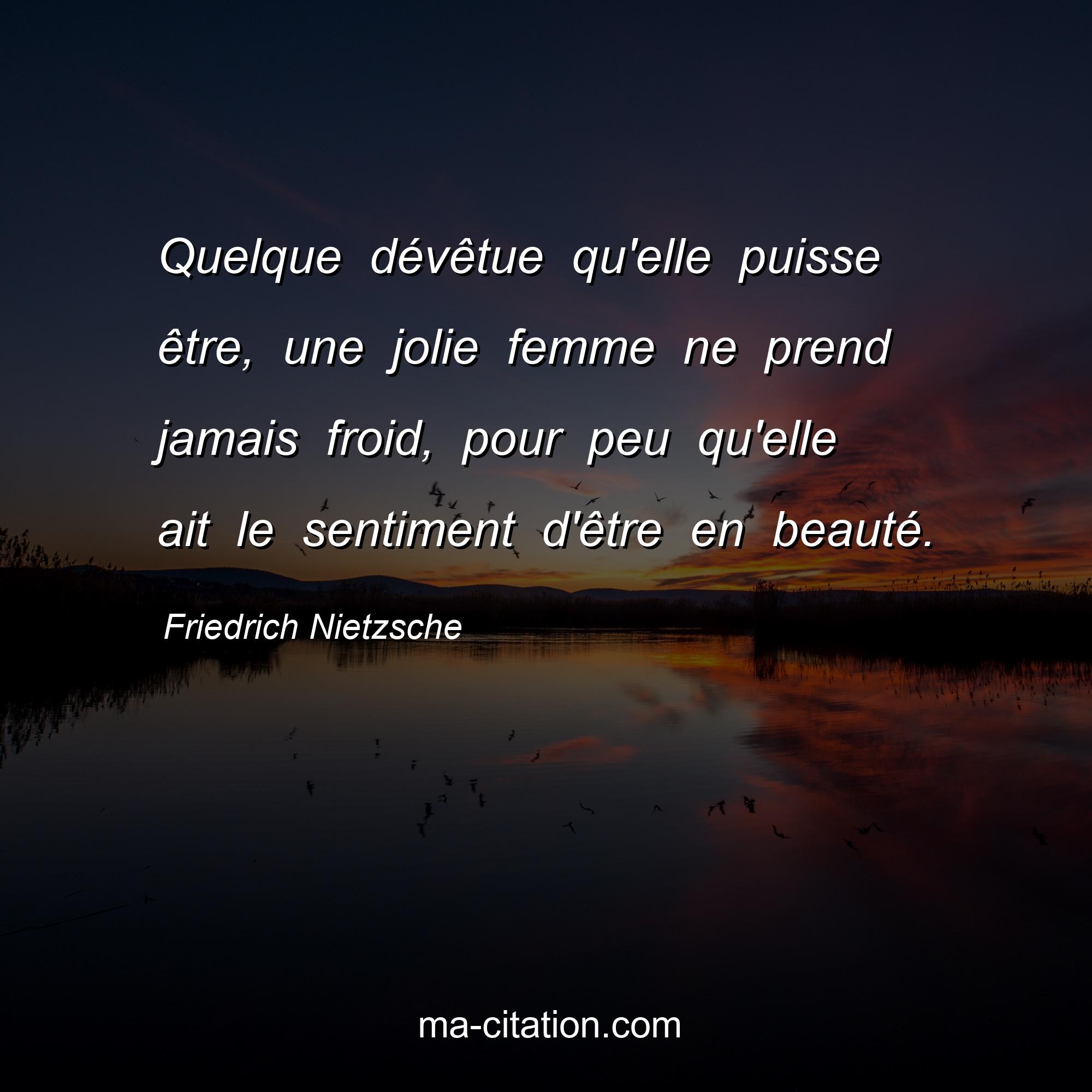 Citation sur la vie de Friedrich Nietzsche :Quelque dévêtue qu'elle puisse être, une jolie femme ne prend jamais froid, pour peu qu'elle ait le sentiment d'être en beauté.