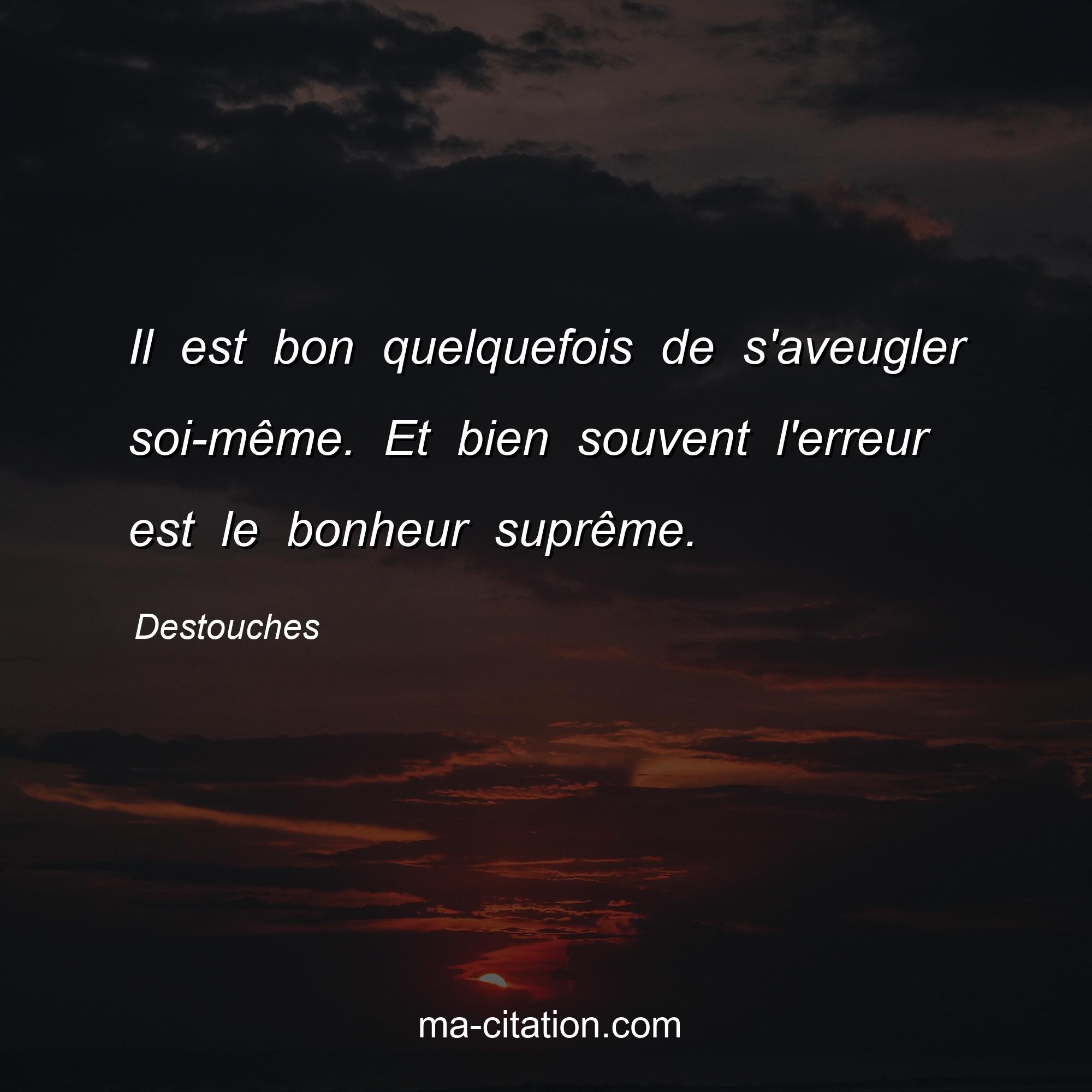 Citation sur la vie de Destouches :Il est bon quelquefois de s'aveugler soi-même. Et bien souvent l'erreur est le bonheur suprême.