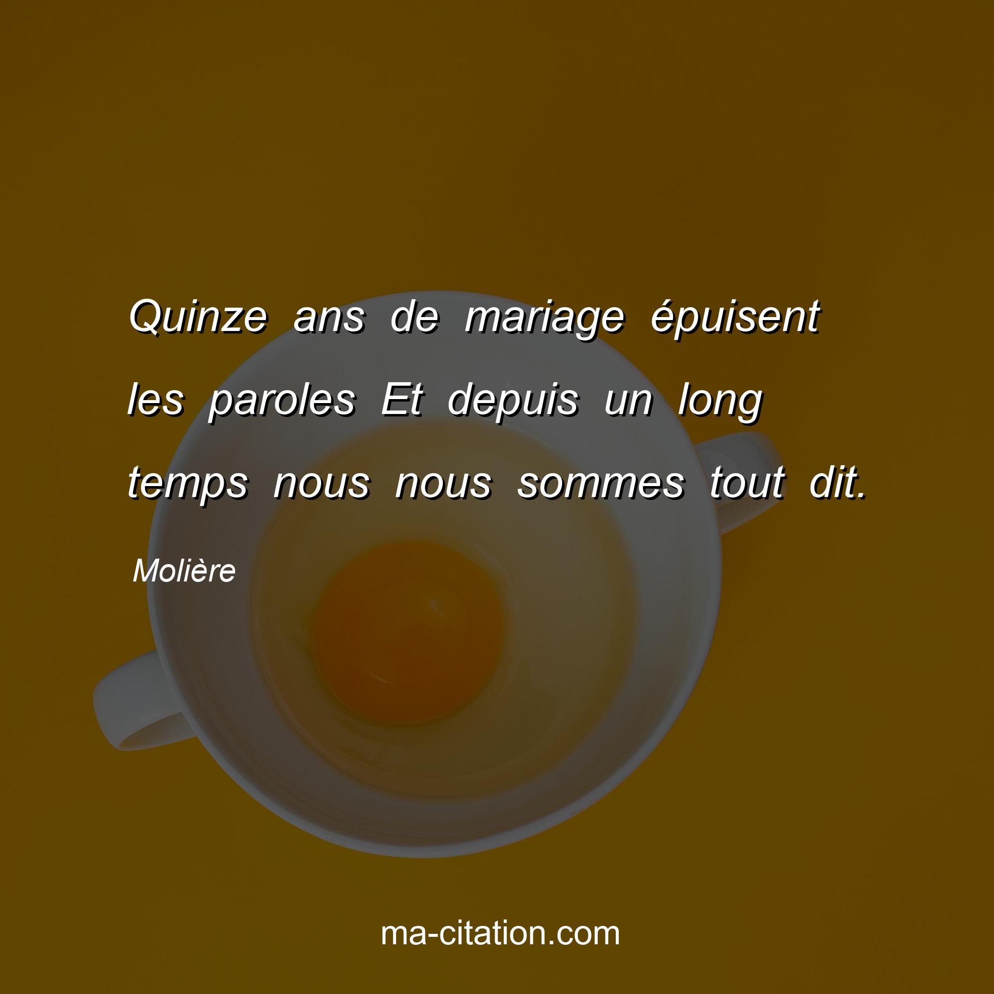 Citation sur la vie de Molière :Quinze ans de mariage épuisent les paroles Et depuis un long temps nous nous sommes tout dit.
