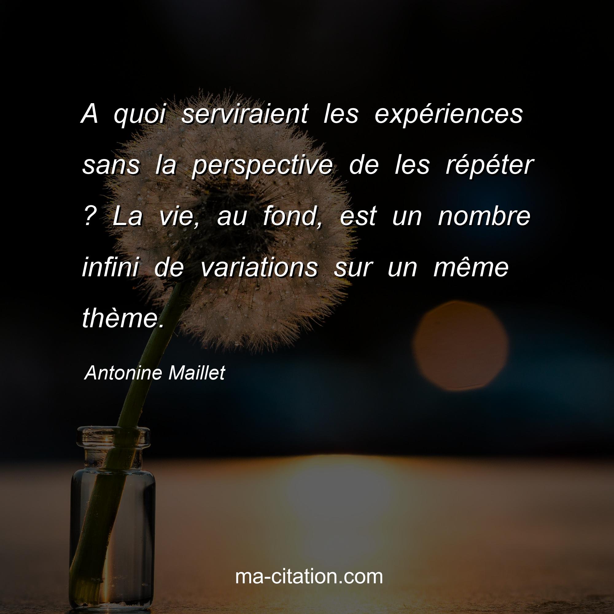 Citation sur la vie d'Antonine Maillet :A quoi serviraient les expériences sans la perspective de les répéter ? La vie, au fond, est un nombre infini de variations sur un même thème.