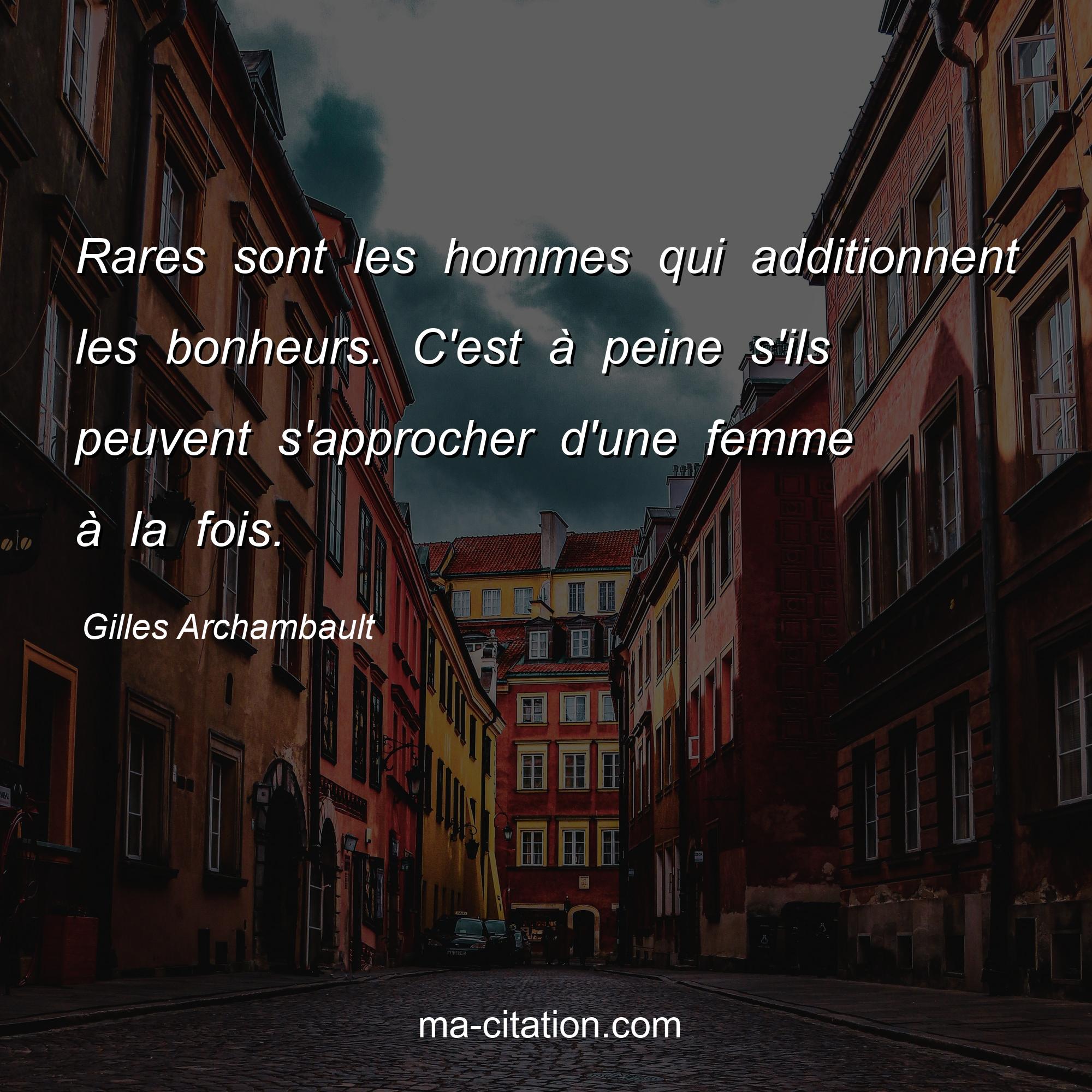 Gilles Archambault est l'auteur de la citation sur la vie "Rares sont les hommes qui additionnent les bonheurs. C'est à peine s'ils peuvent s'approcher d'une femme à la fois.".