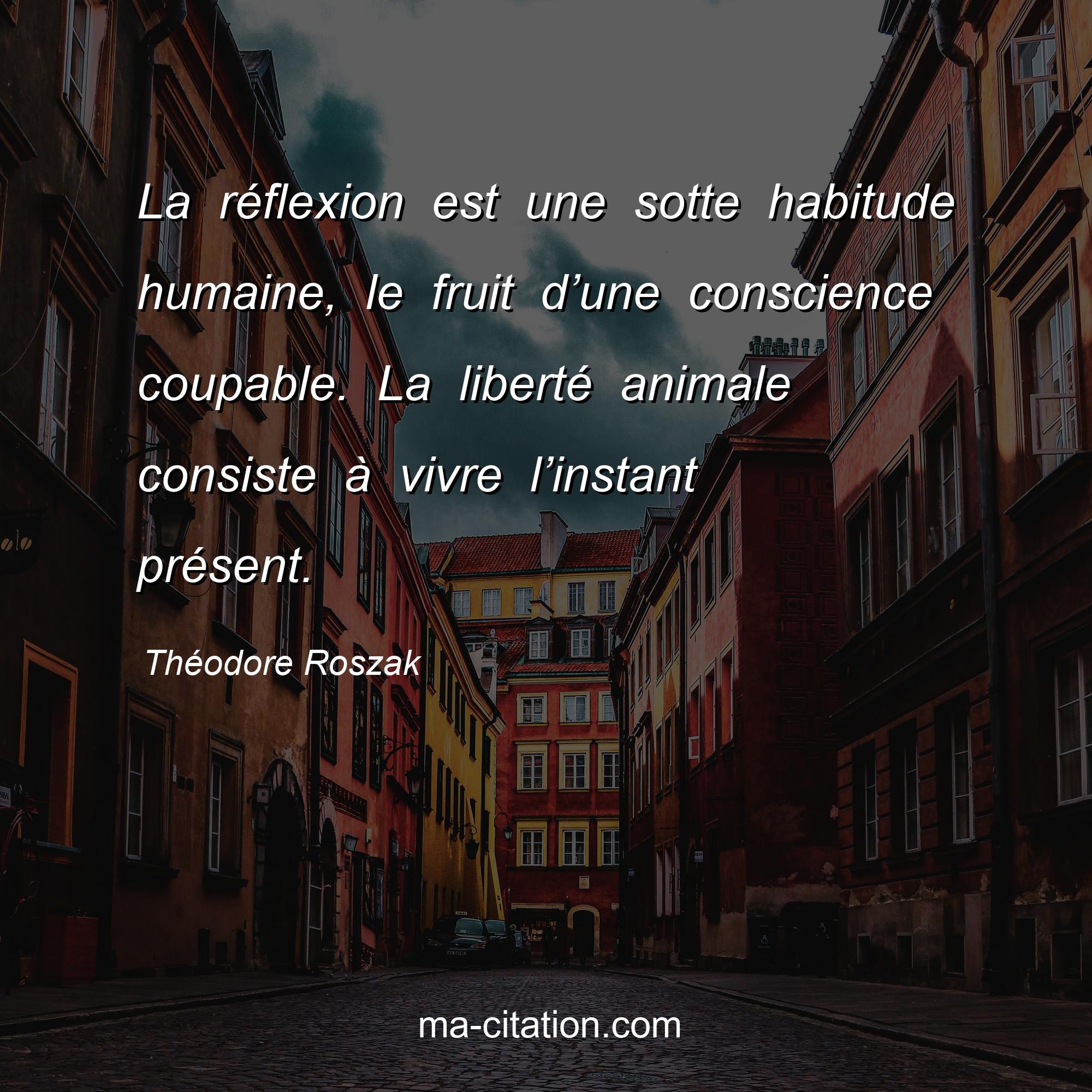 Citation sur la vie de Théodore Roszak :La réflexion est une sotte habitude humaine, le fruit d’une conscience coupable. La liberté animale consiste à vivre l’instant présent.
