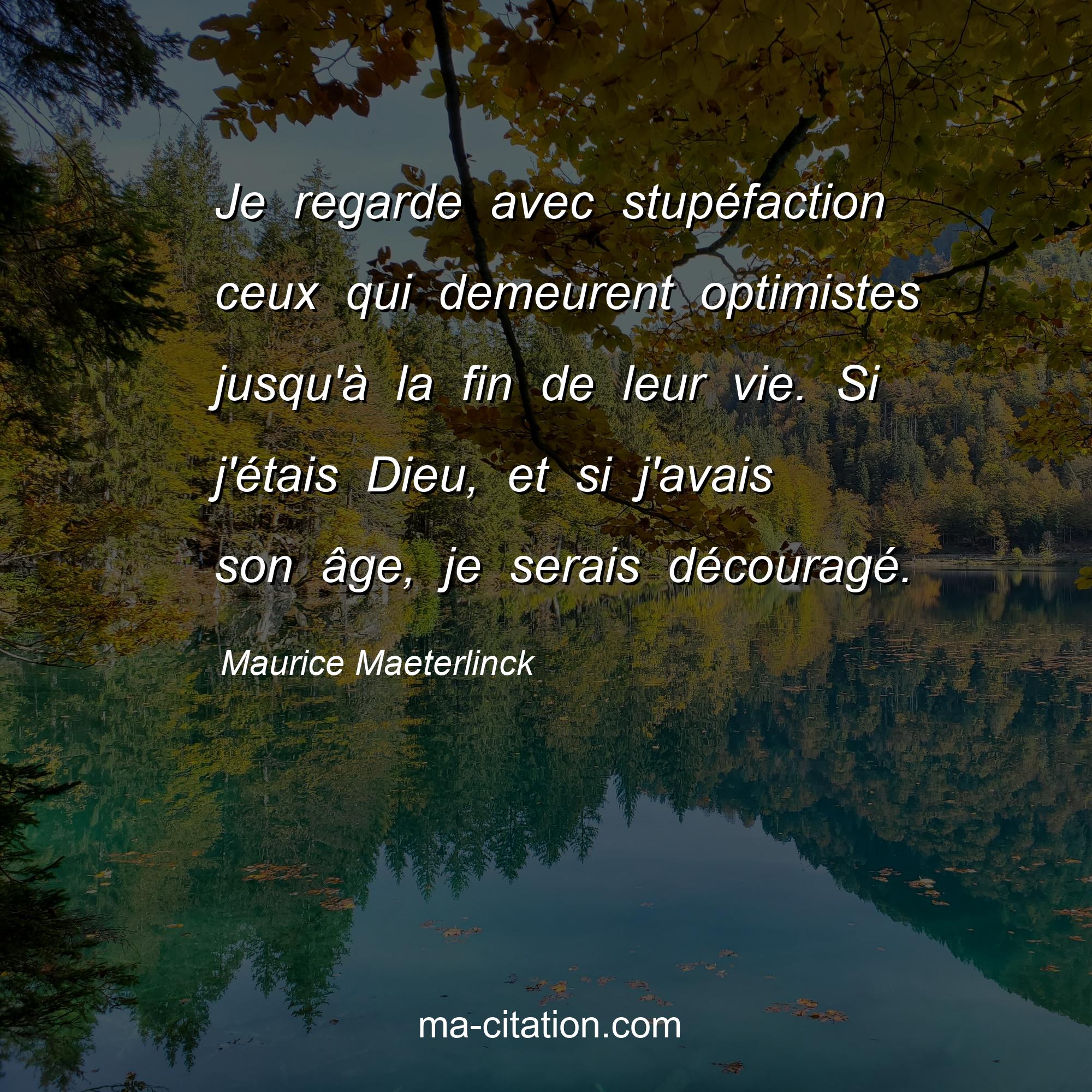 Citation sur la vie de Maurice Maeterlinck :Je regarde avec stupéfaction ceux qui demeurent optimistes jusqu'à la fin de leur vie. Si j'étais Dieu, et si j'avais son âge, je serais découragé.