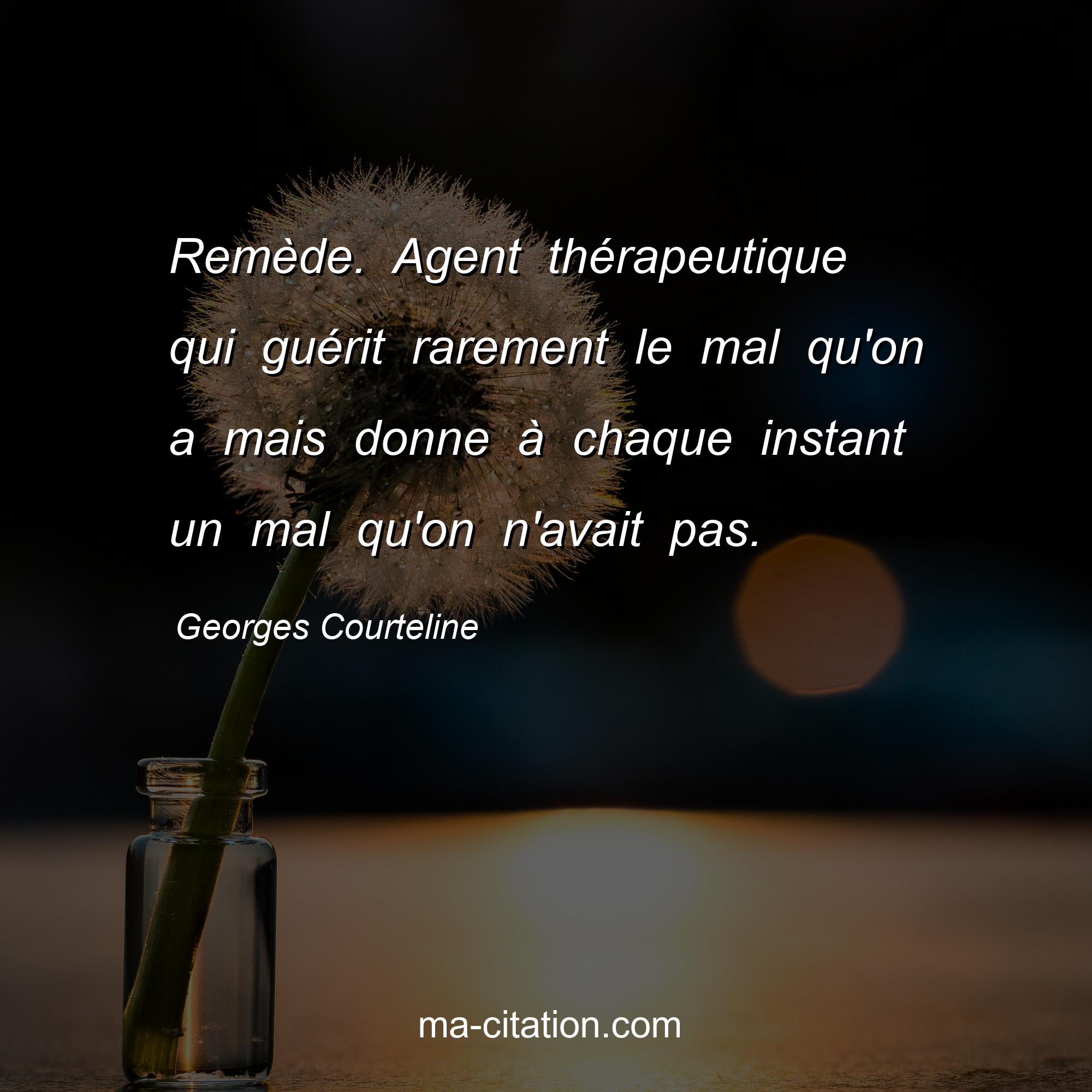 Citation sur la vie de Georges Courteline :Remède. Agent thérapeutique qui guérit rarement le mal qu'on a mais donne à chaque instant un mal qu'on n'avait pas.