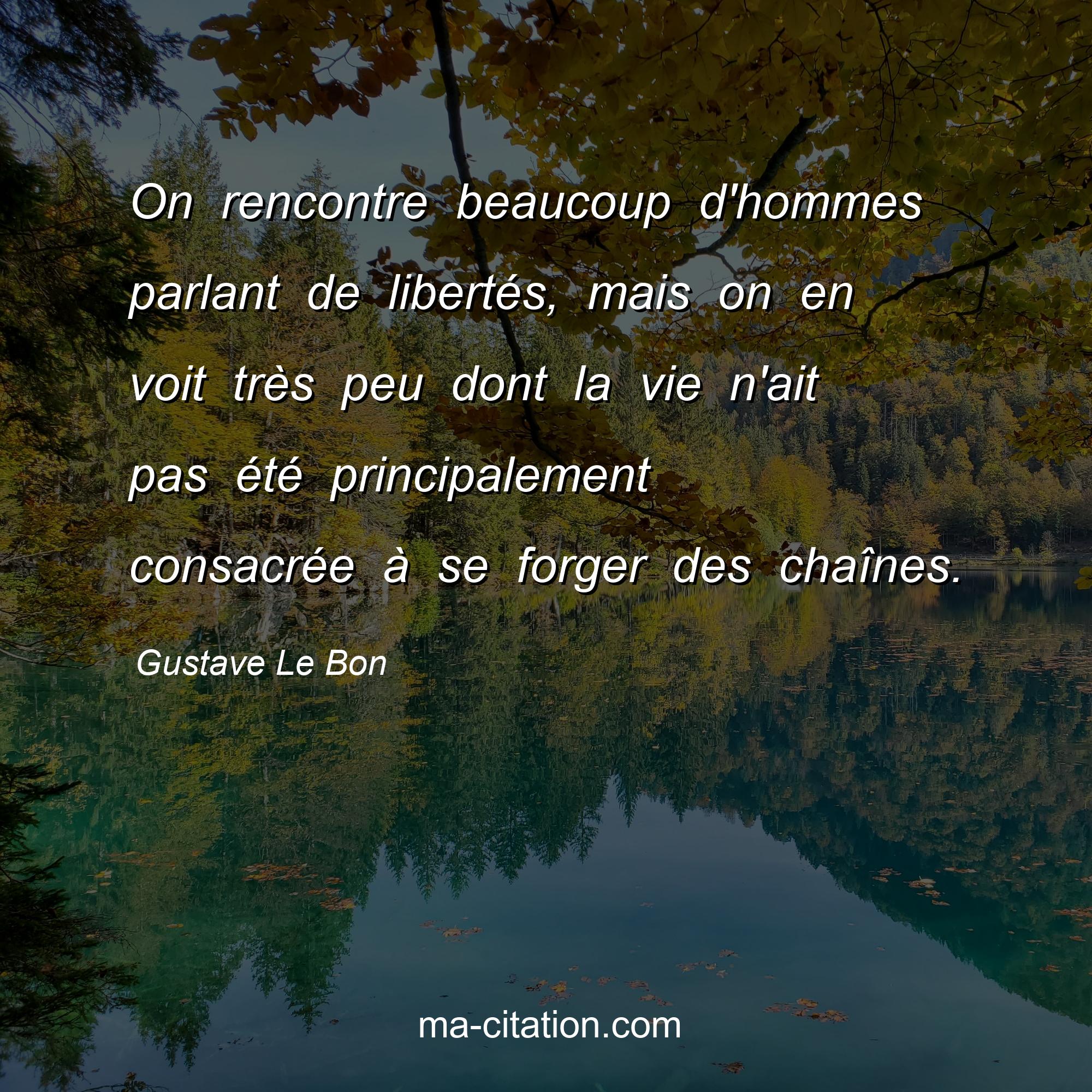Citation sur la vie de Gustave Le Bon :On rencontre beaucoup d'hommes parlant de libertés, mais on en voit très peu dont la vie n'ait pas été principalement consacrée à se forger des chaînes.