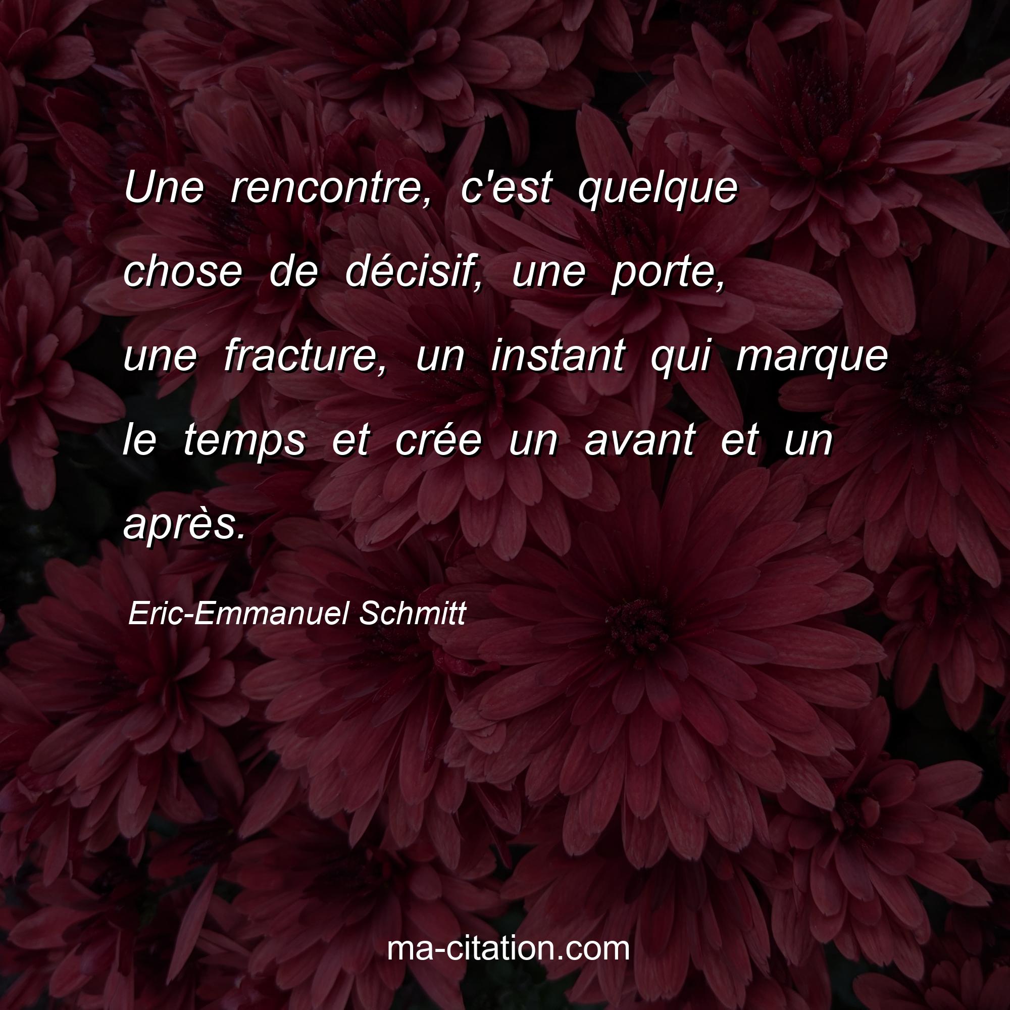 Citation sur la vie d'Eric-Emmanuel Schmitt :Une rencontre, c'est quelque chose de décisif, une porte, une fracture, un instant qui marque le temps et crée un avant et un après.