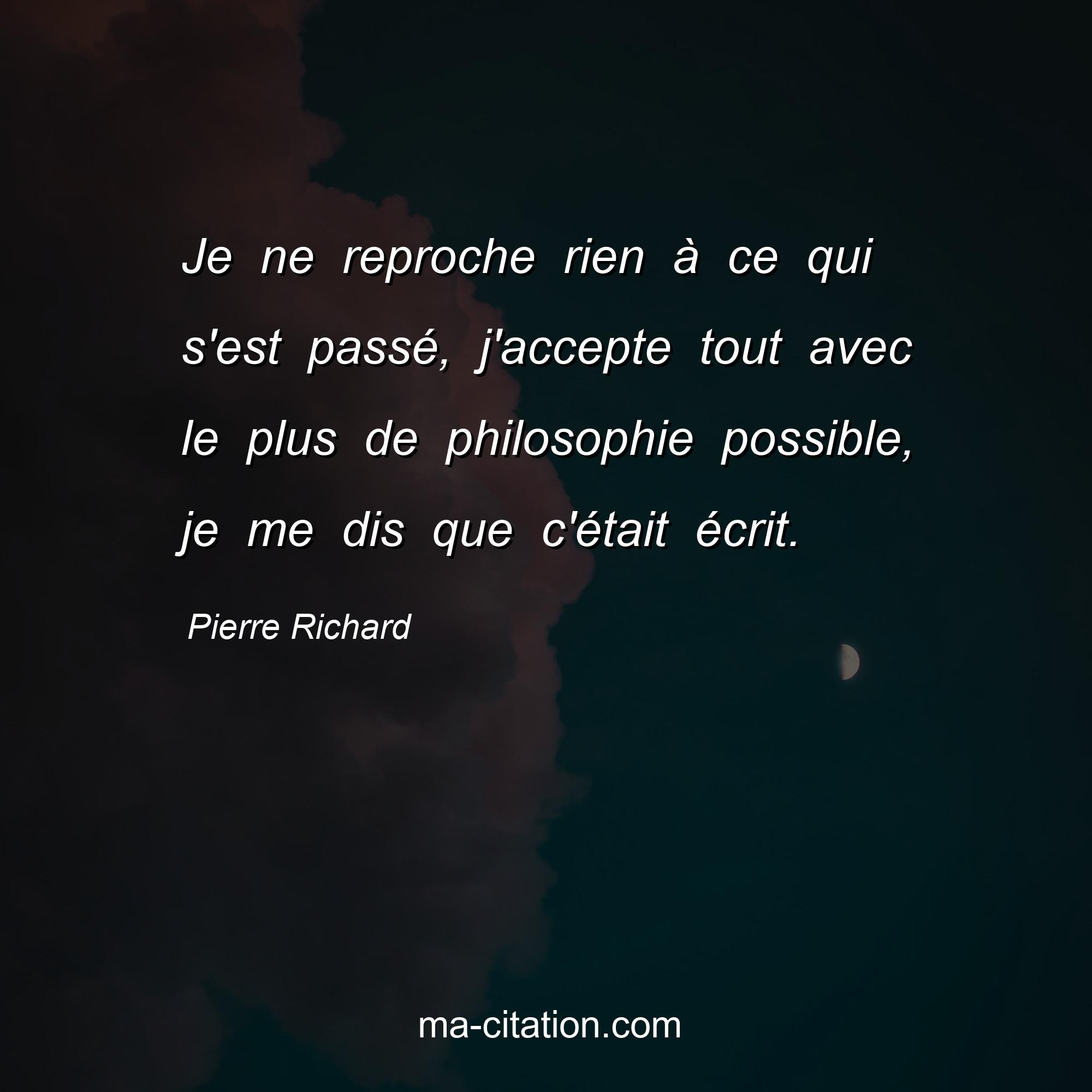 Citation sur la vie de Pierre Richard :Je ne reproche rien à ce qui s'est passé, j'accepte tout avec le plus de philosophie possible, je me dis que c'était écrit.