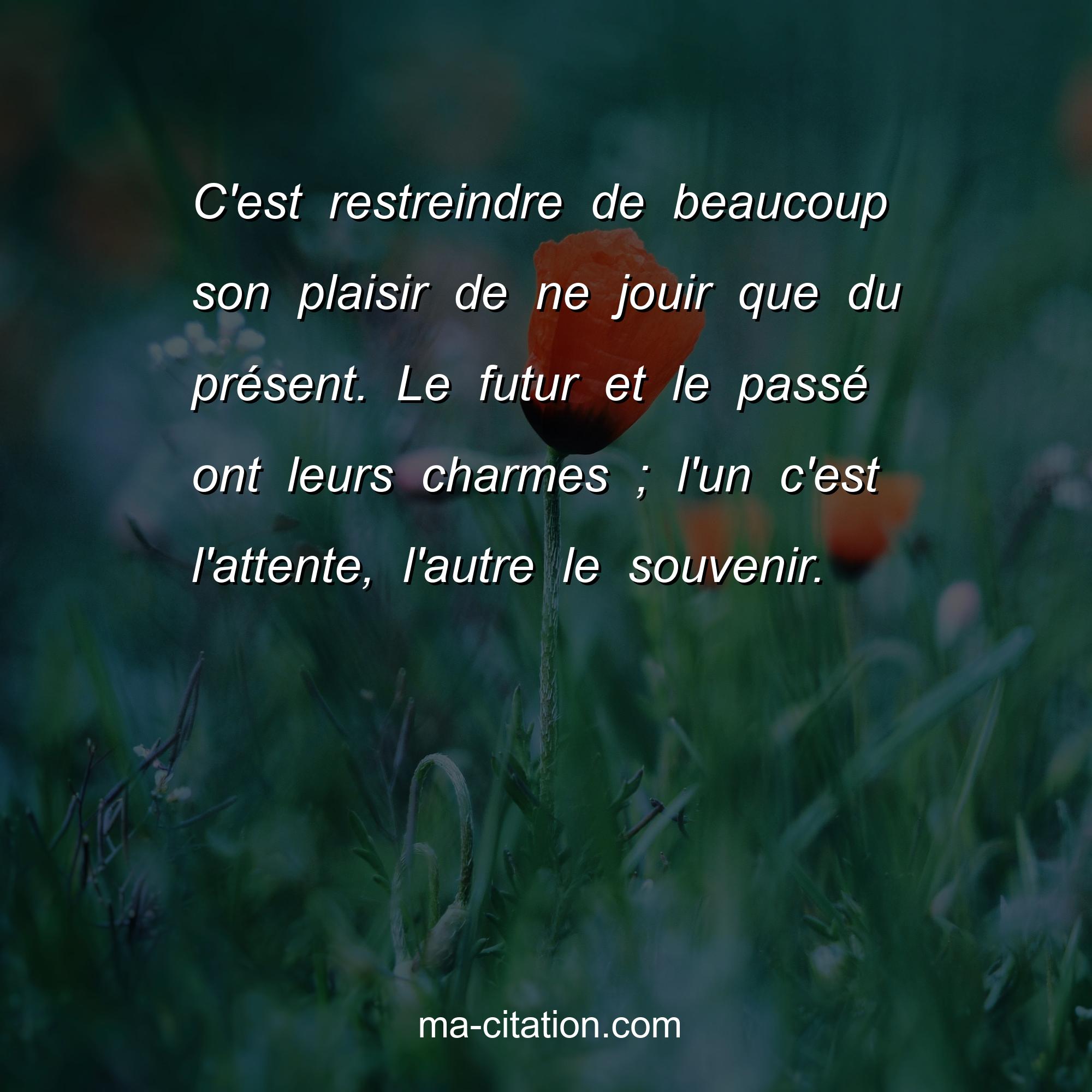 Citation sur la vie :C'est restreindre de beaucoup son plaisir de ne jouir que du présent. Le futur et le passé ont leurs charmes ; l'un c'est l'attente, l'autre le souvenir.