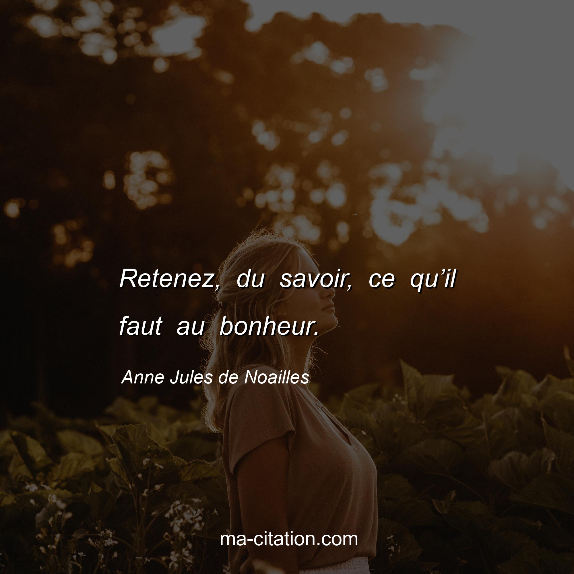 Anne Jules de Noailles est l'auteur de la citation sur la vie "Retenez, du savoir, ce qu’il faut au bonheur.".