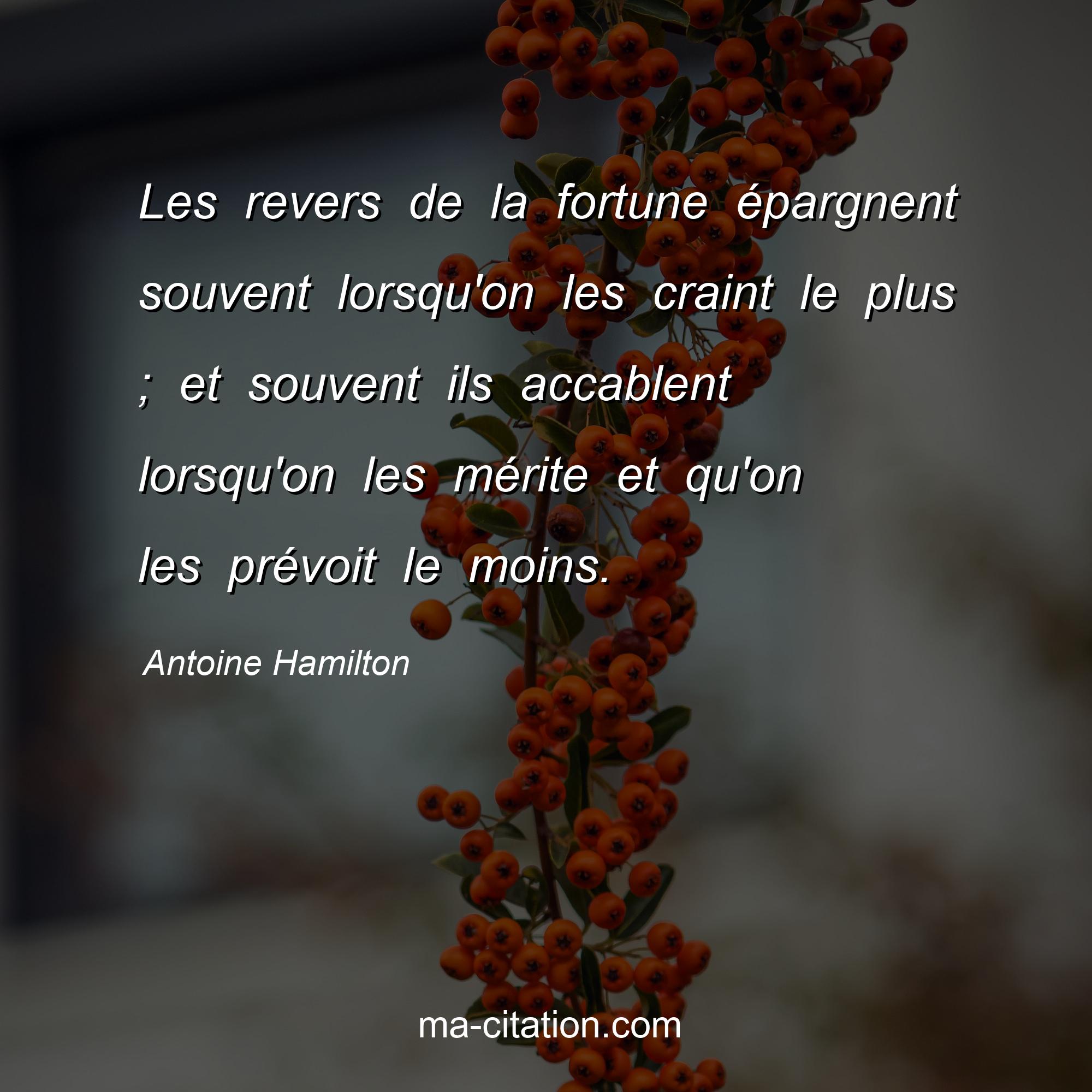 Antoine Hamilton est l'auteur de la citation sur la vie "Les revers de la fortune épargnent souvent lorsqu'on les craint le plus ; et souvent ils accablent lorsqu'on les mérite et qu'on les prévoit le moins.".