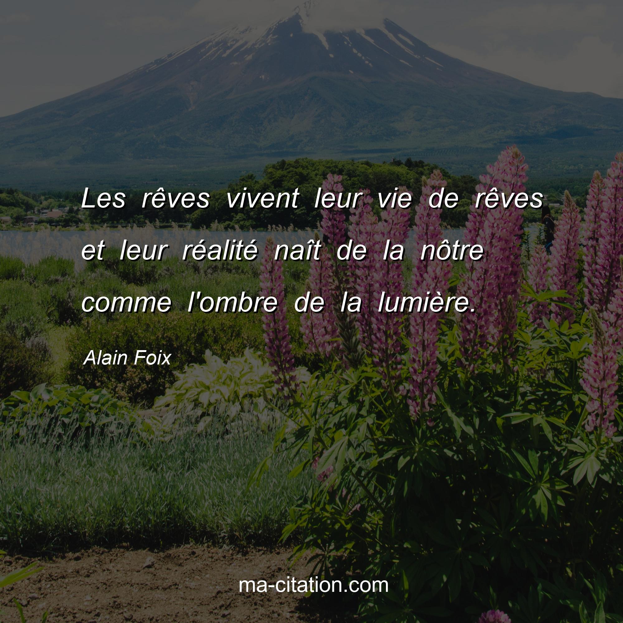 Alain Foix est l'auteur de la citation sur la vie "Les rêves vivent leur vie de rêves et leur réalité naît de la nôtre comme l'ombre de la lumière.".