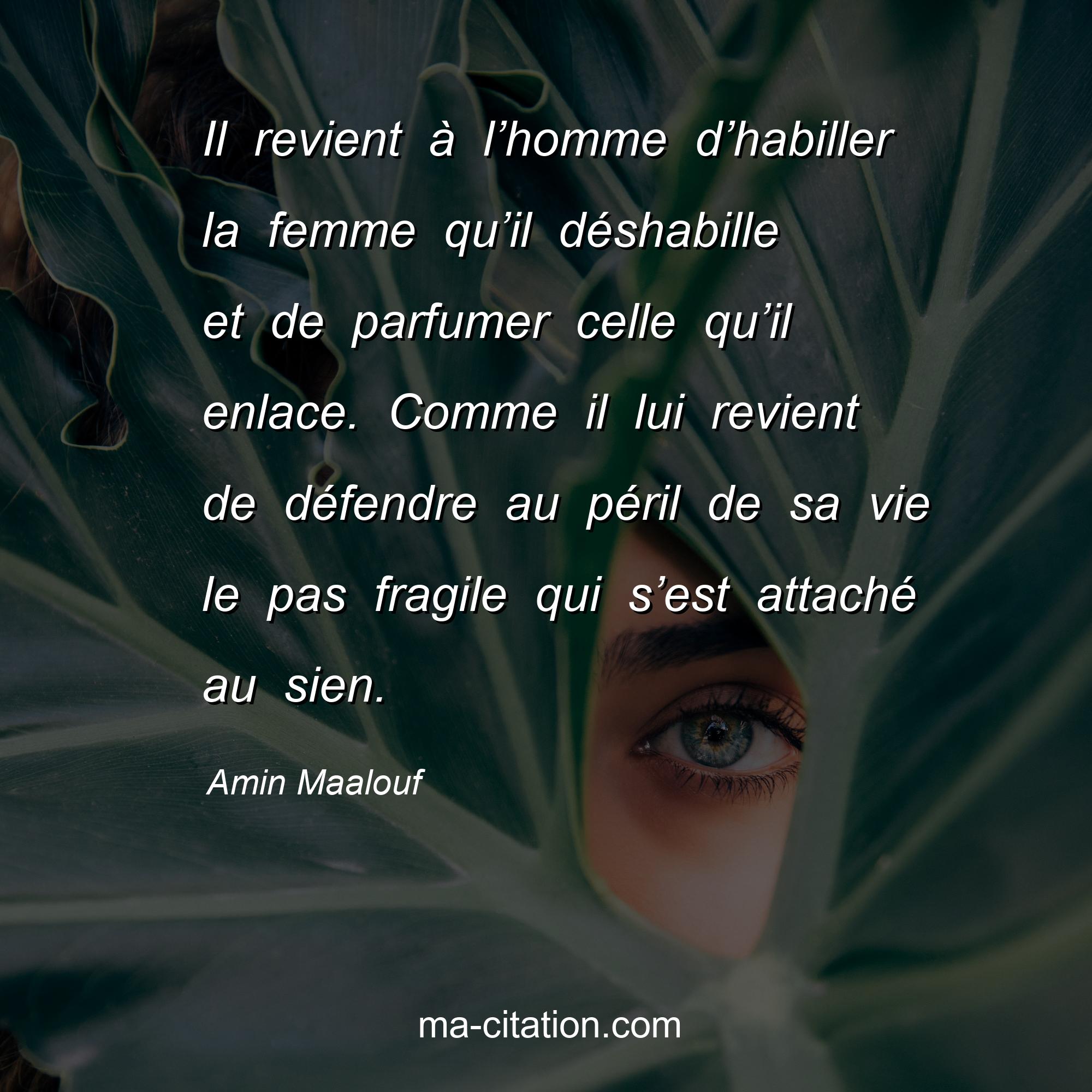 Citation sur la vie d'Amin Maalouf :Il revient à l’homme d’habiller la femme qu’il déshabille et de parfumer celle qu’il enlace. Comme il lui revient de défendre au péril de sa vie le pas fragile qui s’est attaché au sien.