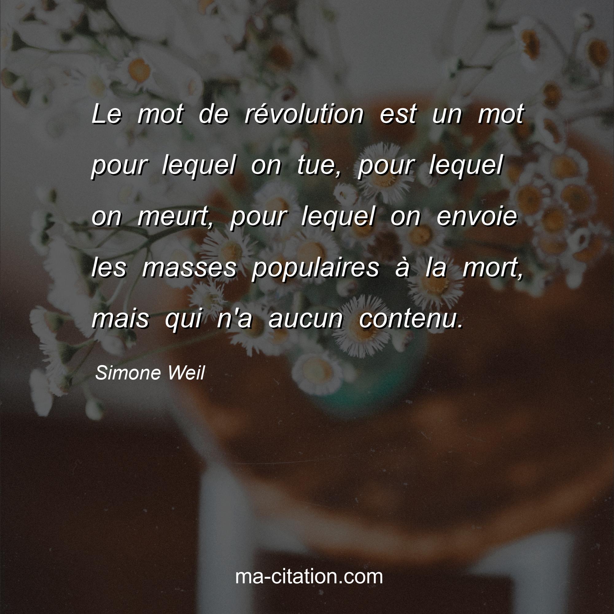 Citation sur la vie de Simone Weil :Le mot de révolution est un mot pour lequel on tue, pour lequel on meurt, pour lequel on envoie les masses populaires à la mort, mais qui n'a aucun contenu.