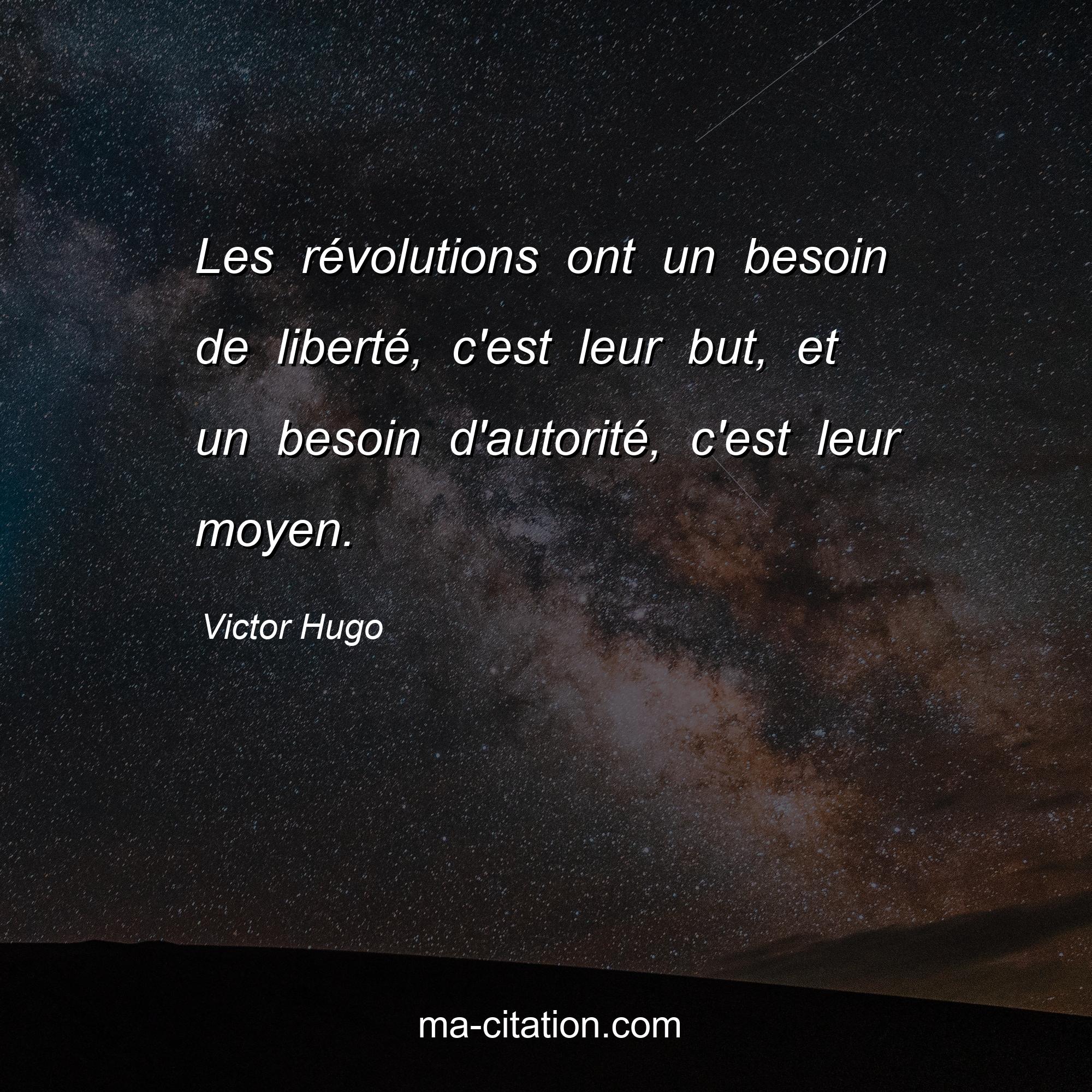 Citation sur la vie de Victor Hugo :Les révolutions ont un besoin de liberté, c'est leur but, et un besoin d'autorité, c'est leur moyen.