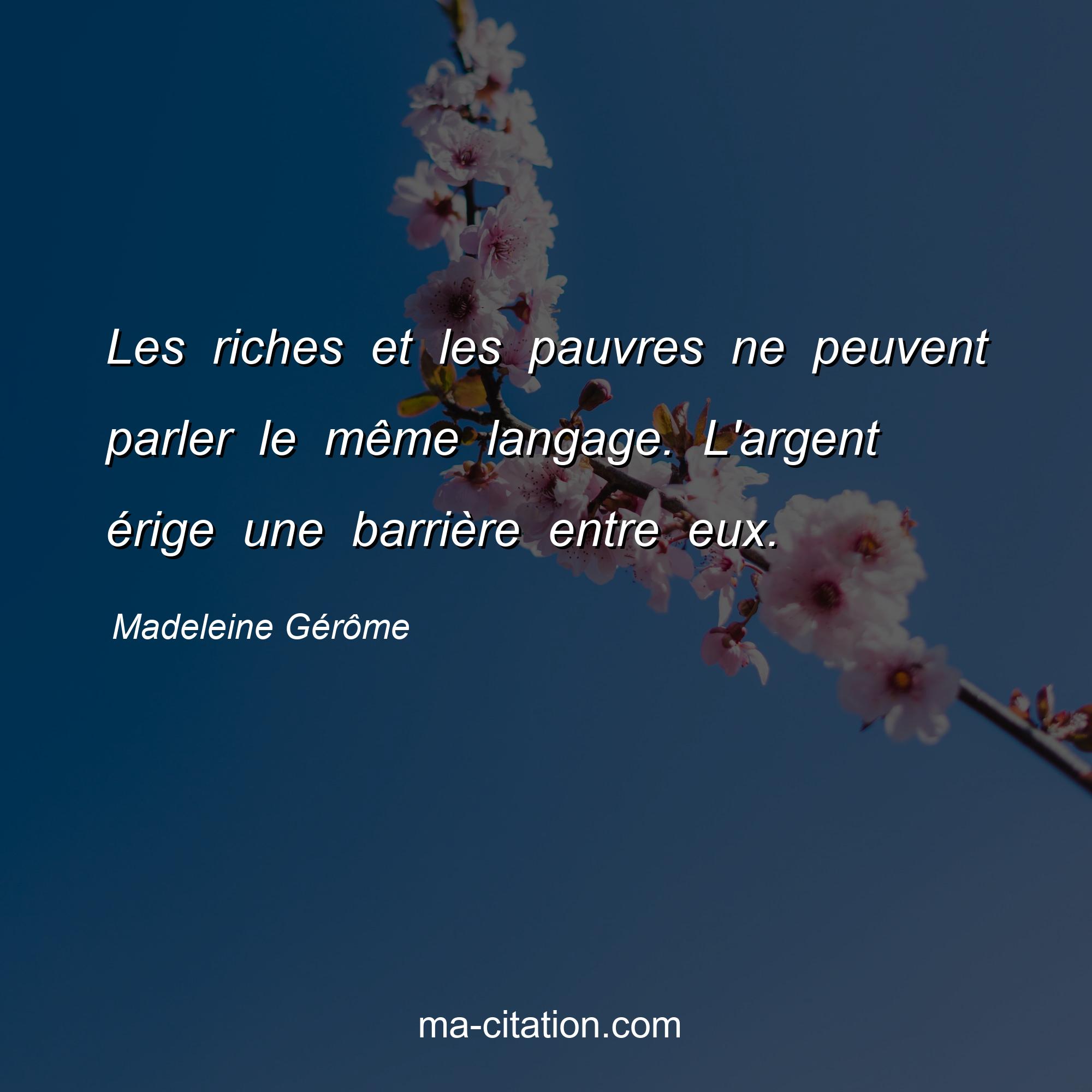 Citation sur la vie de Madeleine Gérôme :Les riches et les pauvres ne peuvent parler le même langage. L'argent érige une barrière entre eux.