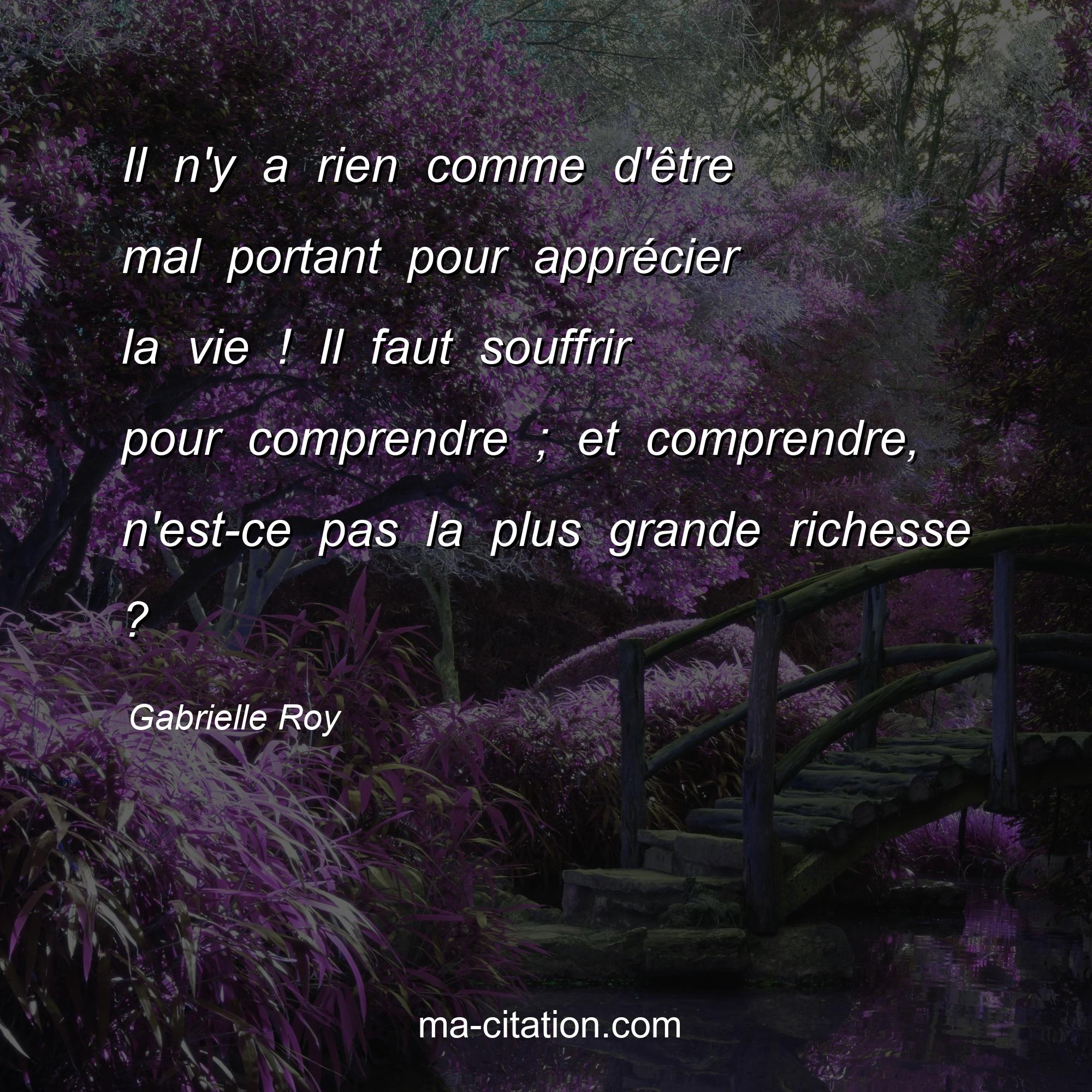 Citation sur la vie de Gabrielle Roy :Il n'y a rien comme d'être mal portant pour apprécier la vie ! Il faut souffrir pour comprendre ; et comprendre, n'est-ce pas la plus grande richesse ?