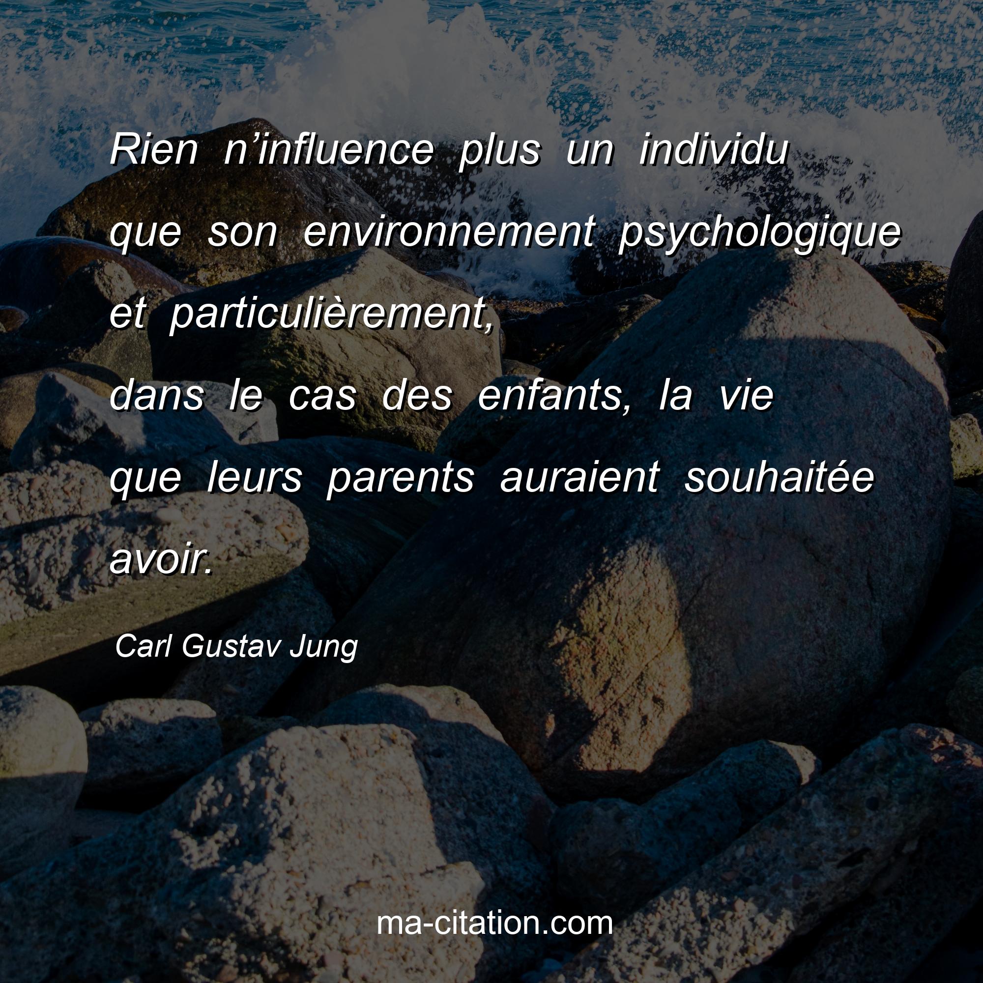 Citation sur la vie de Carl Gustav Jung :Rien n’influence plus un individu que son environnement psychologique et particulièrement, dans le cas des enfants, la vie que leurs parents auraient souhaitée avoir.