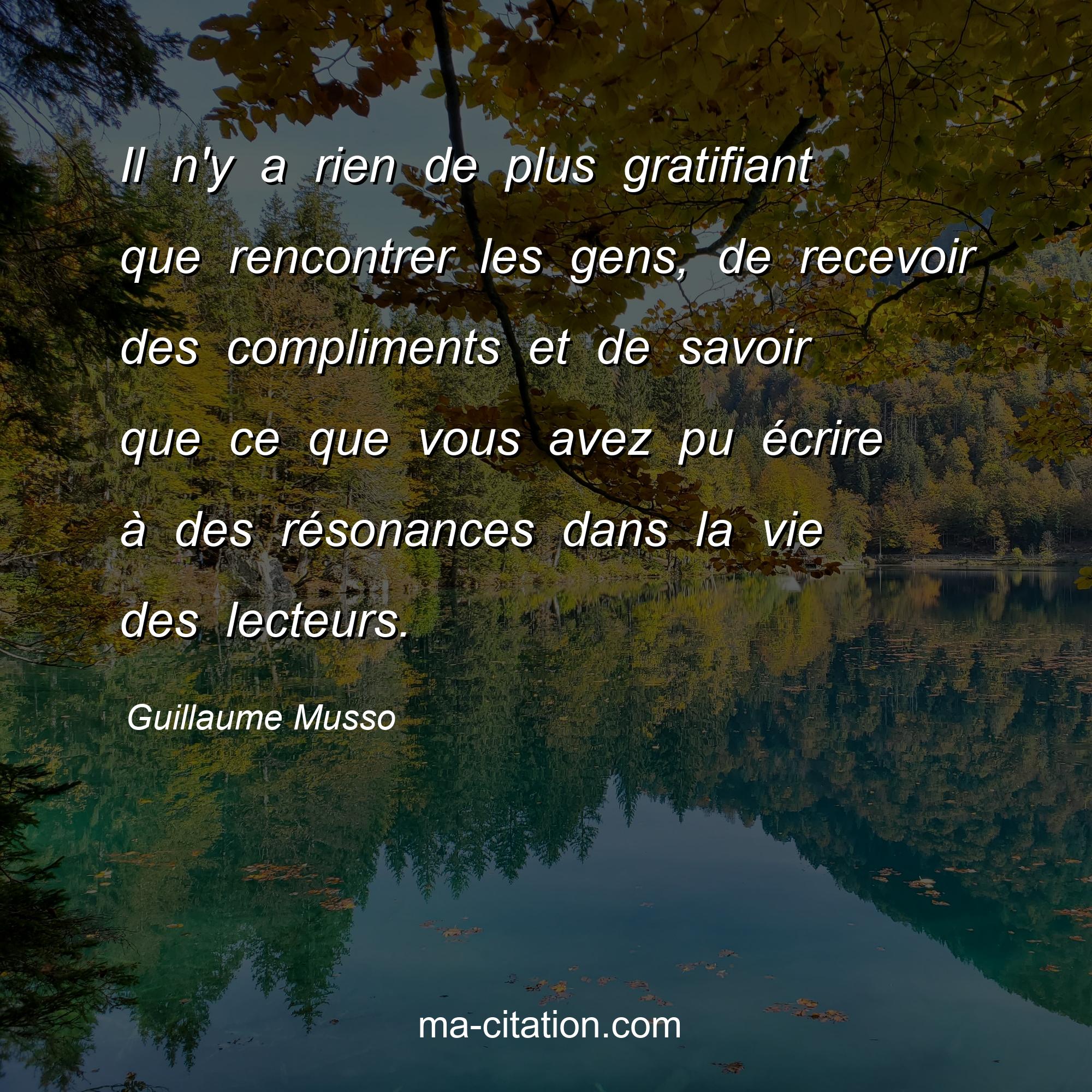 Guillaume Musso est l'auteur de la citation sur la vie "Il n'y a rien de plus gratifiant que rencontrer les gens, de recevoir des compliments et de savoir que ce que vous avez pu écrire à des résonances dans la vie des lecteurs.".