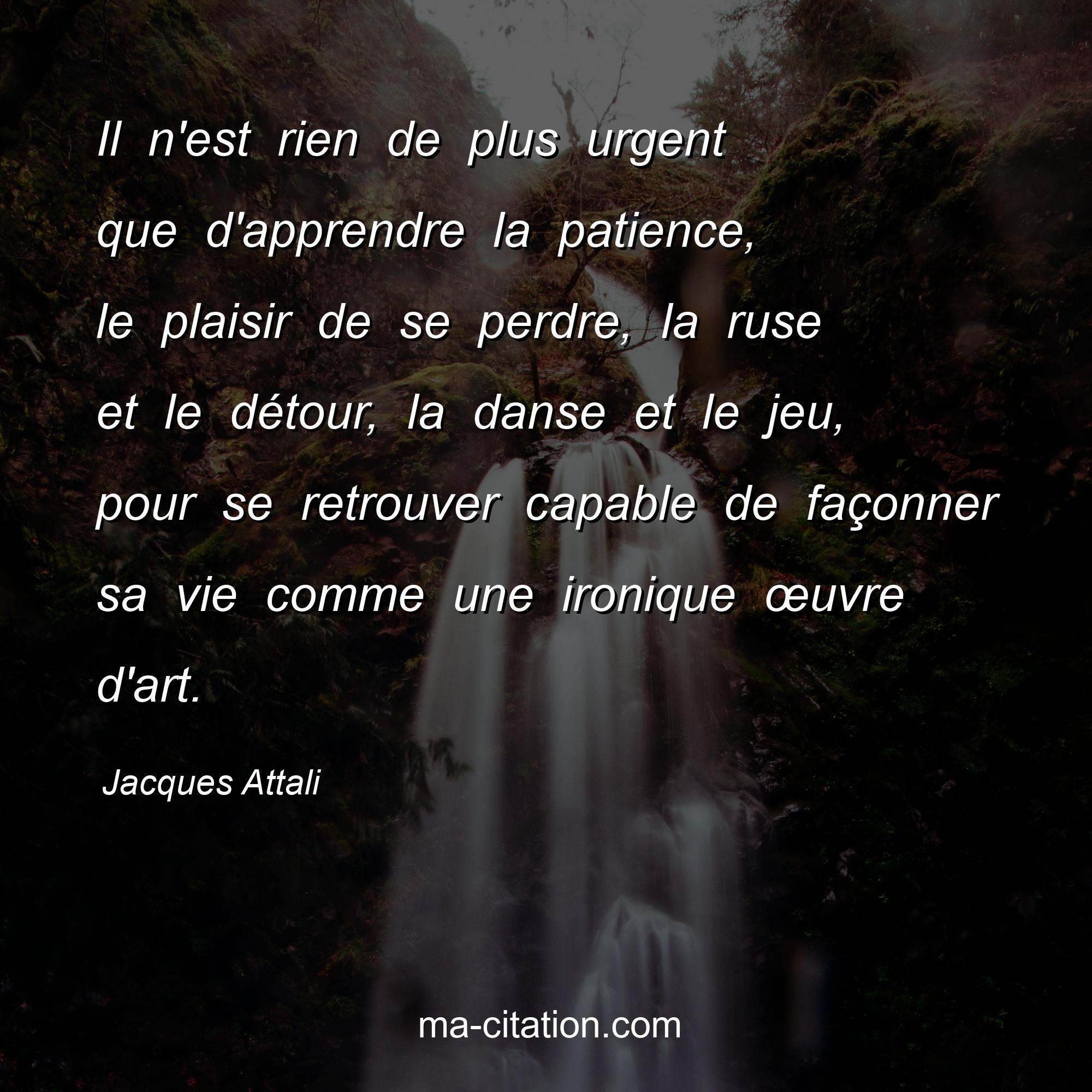 Citation sur la vie de Jacques Attali :Il n'est rien de plus urgent que d'apprendre la patience, le plaisir de se perdre, la ruse et le détour, la danse et le jeu, pour se retrouver capable de façonner sa vie comme une ironique œuvre d'art.