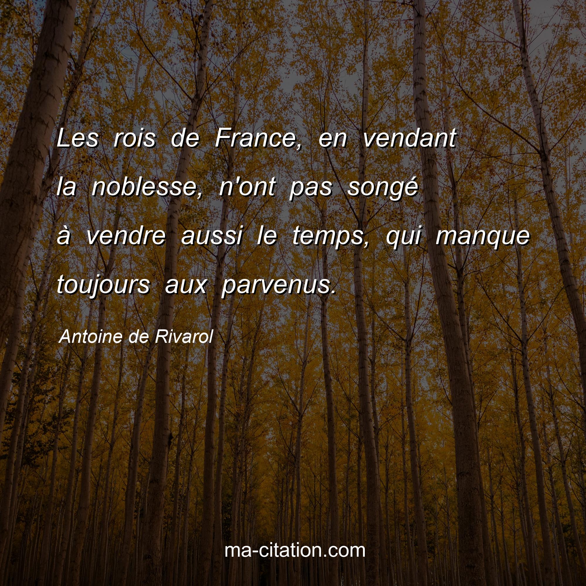 Citation sur la vie d'Antoine de Rivarol :Les rois de France, en vendant la noblesse, n'ont pas songé à vendre aussi le temps, qui manque toujours aux parvenus.