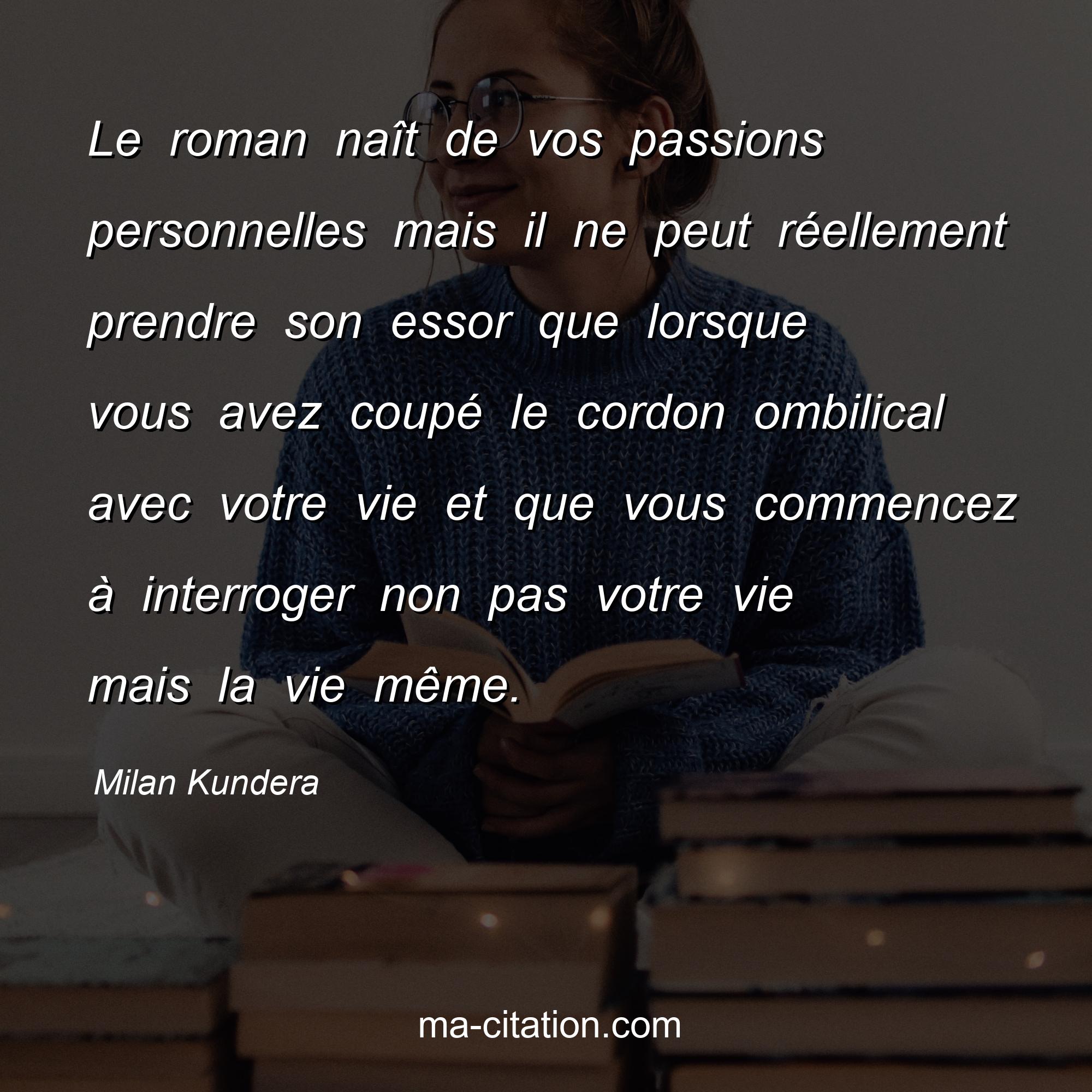 Citation sur la vie de Milan Kundera :Le roman naît de vos passions personnelles mais il ne peut réellement prendre son essor que lorsque vous avez coupé le cordon ombilical avec votre vie et que vous commencez à interroger non pas votre vie mais la vie même.