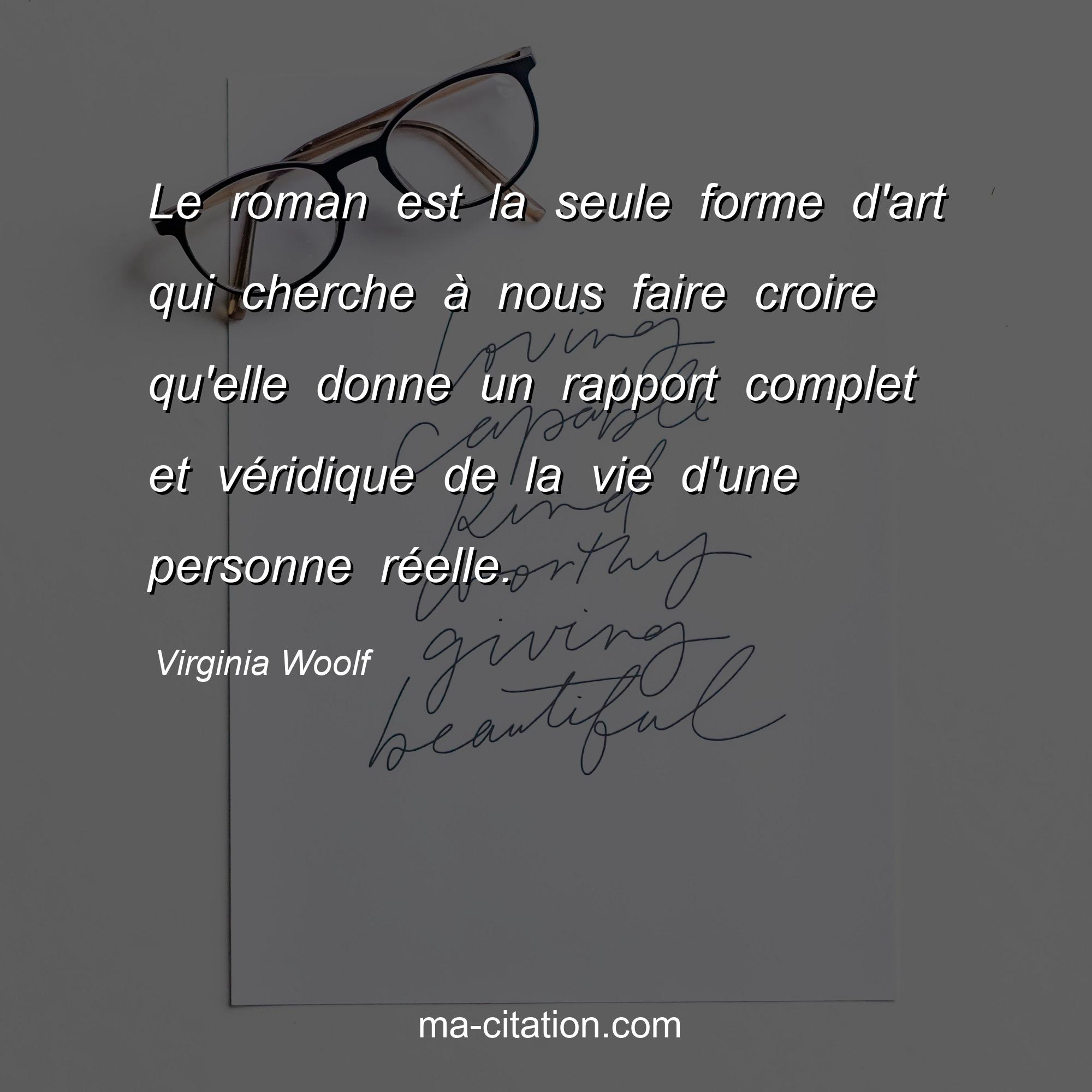 Citation sur la vie de Virginia Woolf :Le roman est la seule forme d'art qui cherche à nous faire croire qu'elle donne un rapport complet et véridique de la vie d'une personne réelle.