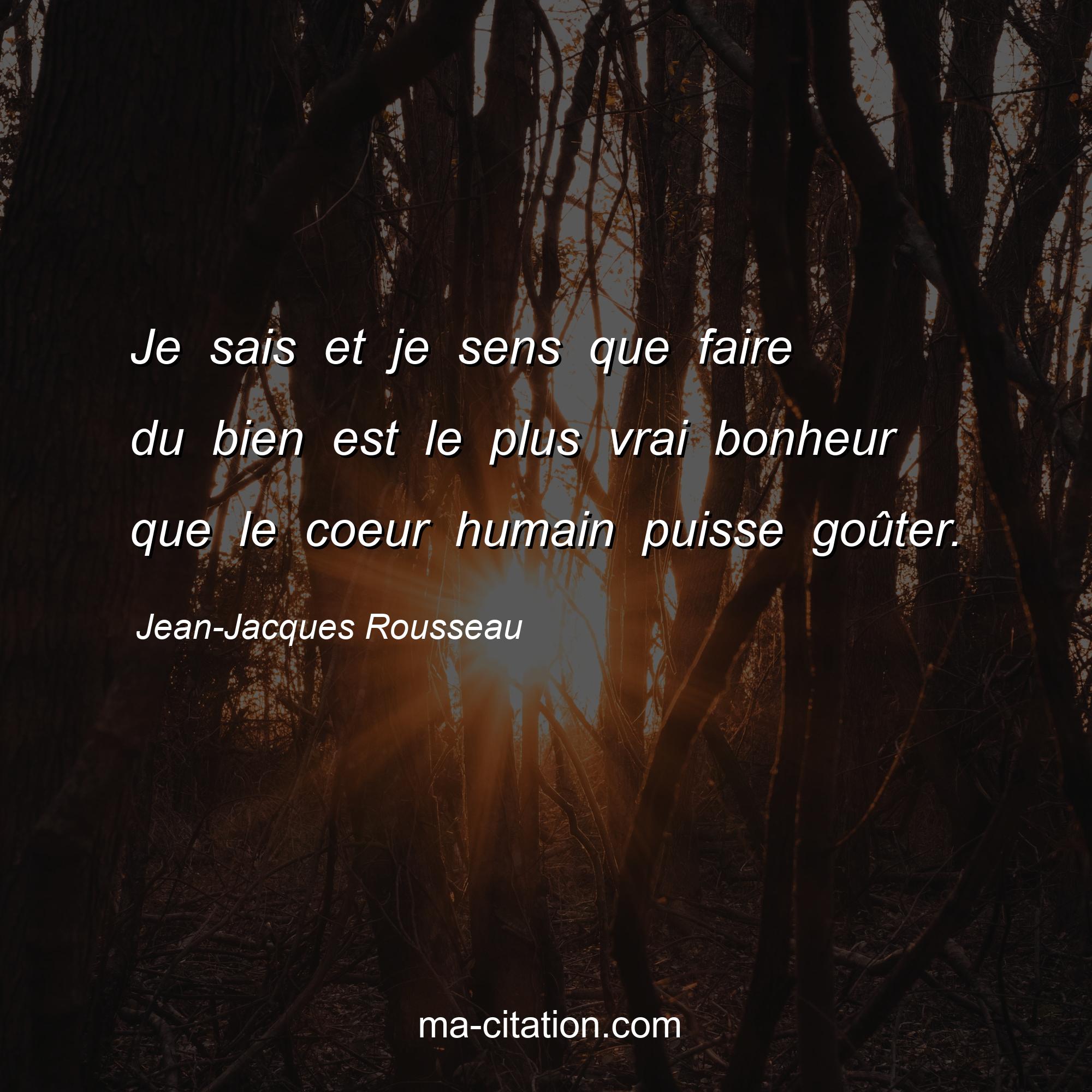 Citation sur la vie de Jean-Jacques Rousseau :Je sais et je sens que faire du bien est le plus vrai bonheur que le coeur humain puisse goûter.