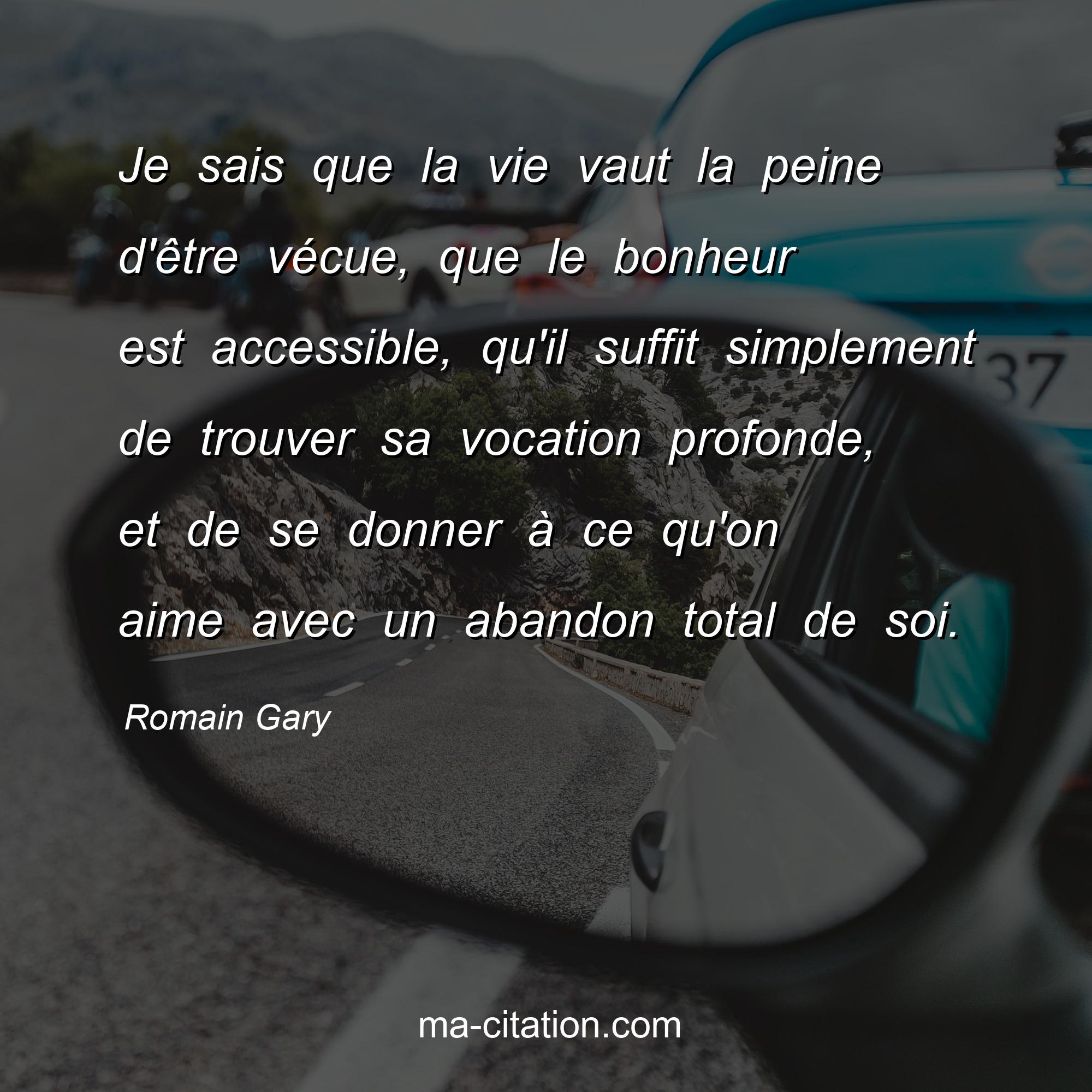 Citation sur la vie de Romain Gary :Je sais que la vie vaut la peine d'être vécue, que le bonheur est accessible, qu'il suffit simplement de trouver sa vocation profonde, et de se donner à ce qu'on aime avec un abandon total de soi.