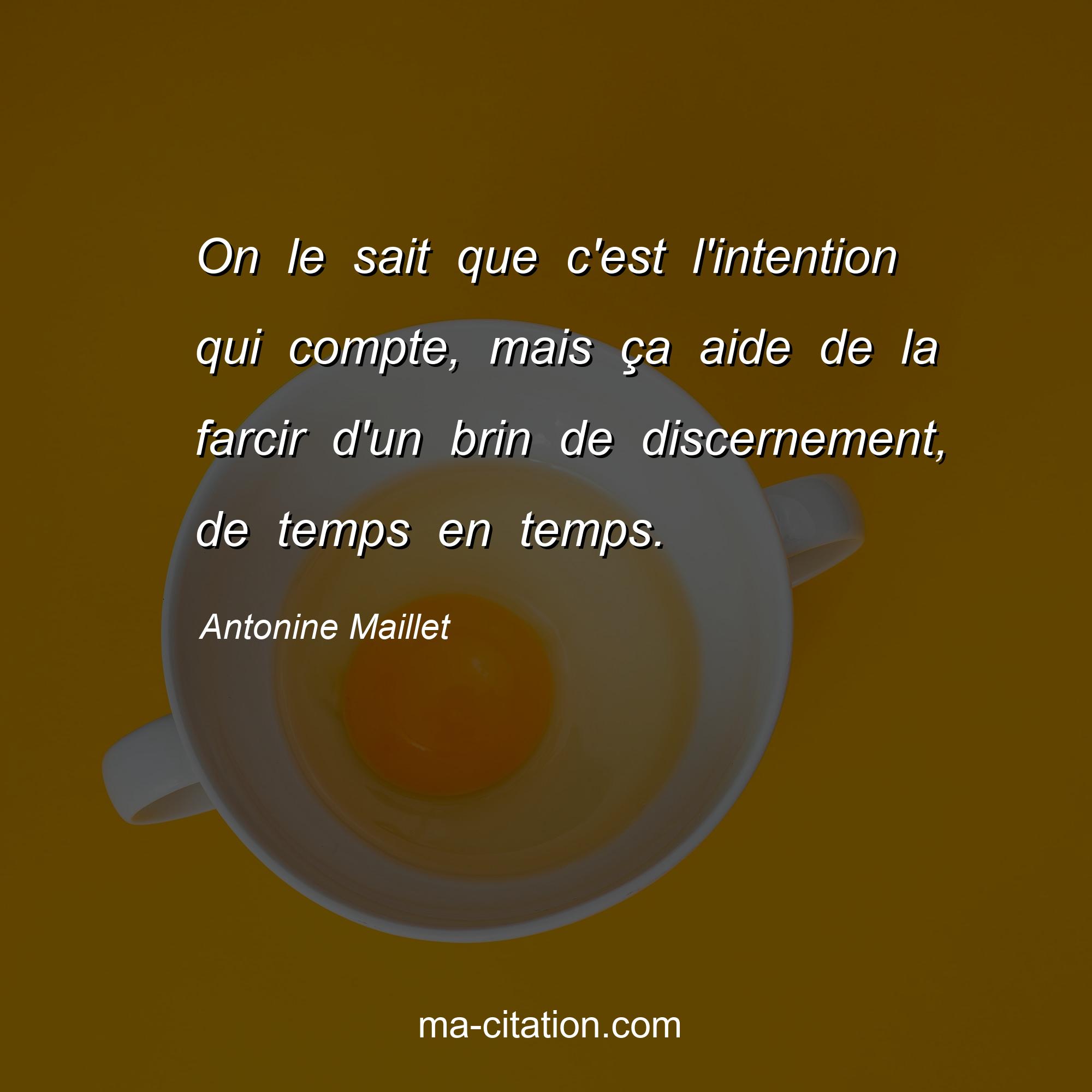 Citation sur la vie d'Antonine Maillet :On le sait que c'est l'intention qui compte, mais ça aide de la farcir d'un brin de discernement, de temps en temps.