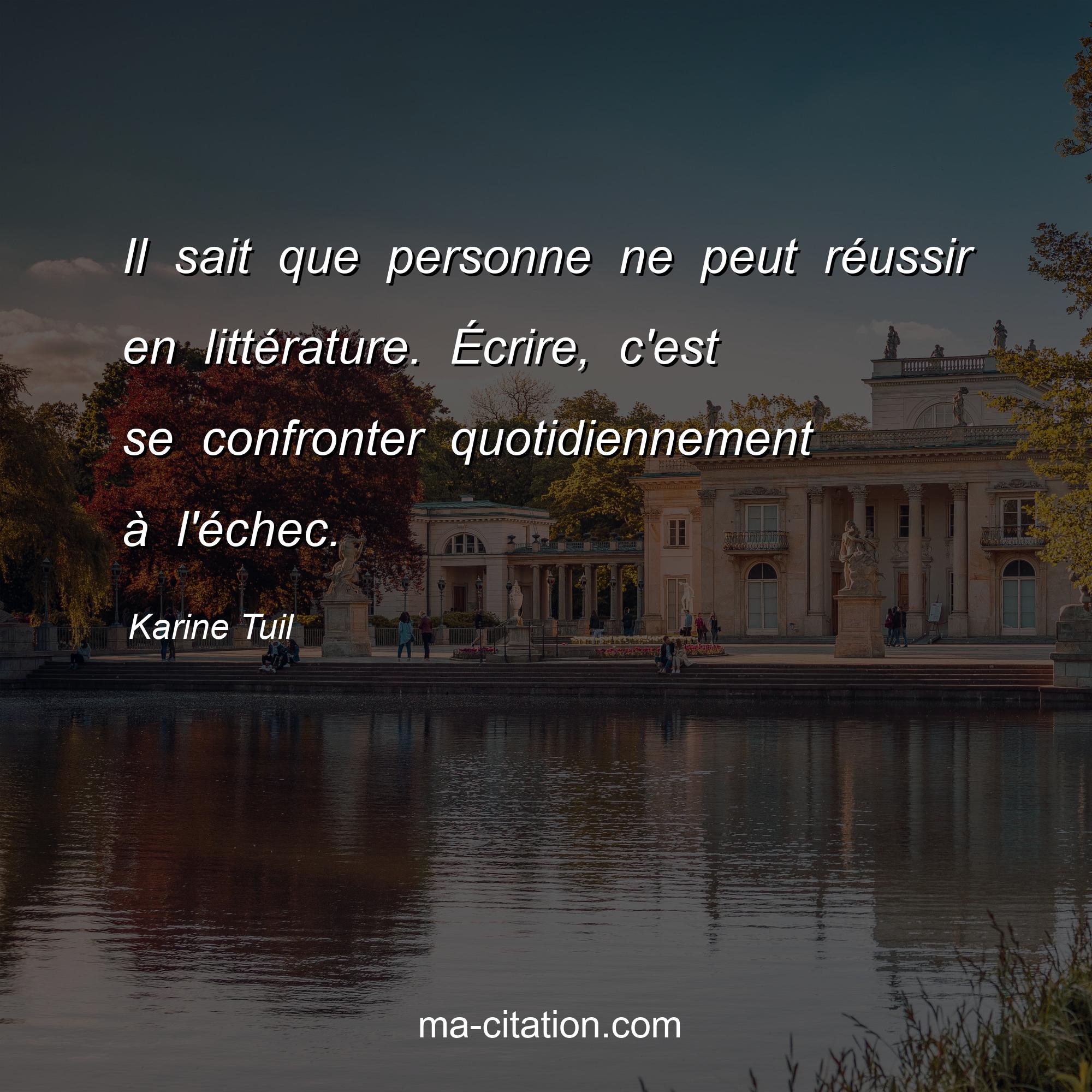 Citation sur la vie de Karine Tuil :Il sait que personne ne peut réussir en littérature. Écrire, c'est se confronter quotidiennement à l'échec.