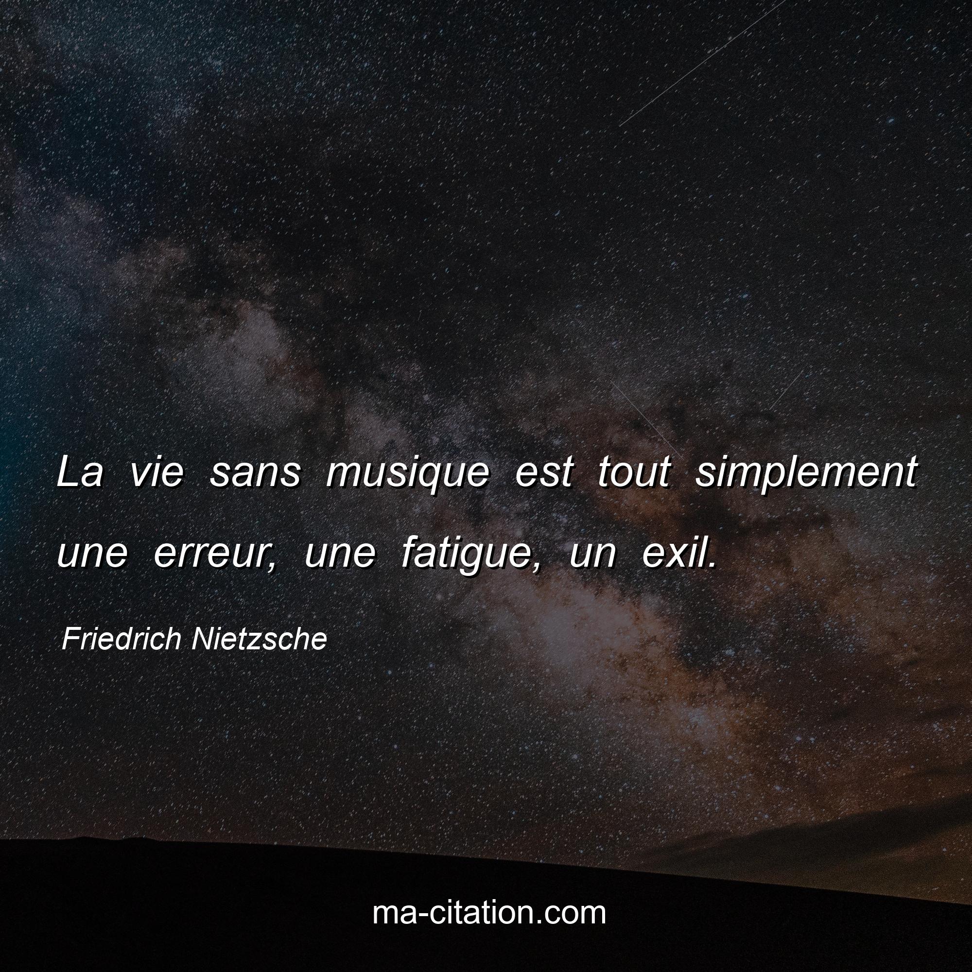 Citation sur la vie de Friedrich Nietzsche :La vie sans musique est tout simplement une erreur, une fatigue, un exil.