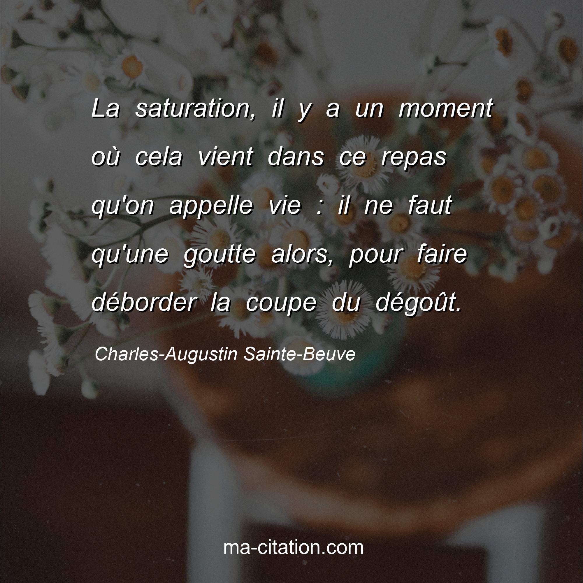 Citation sur la vie de Charles-Augustin Sainte-Beuve :La saturation, il y a un moment où cela vient dans ce repas qu'on appelle vie : il ne faut qu'une goutte alors, pour faire déborder la coupe du dégoût.