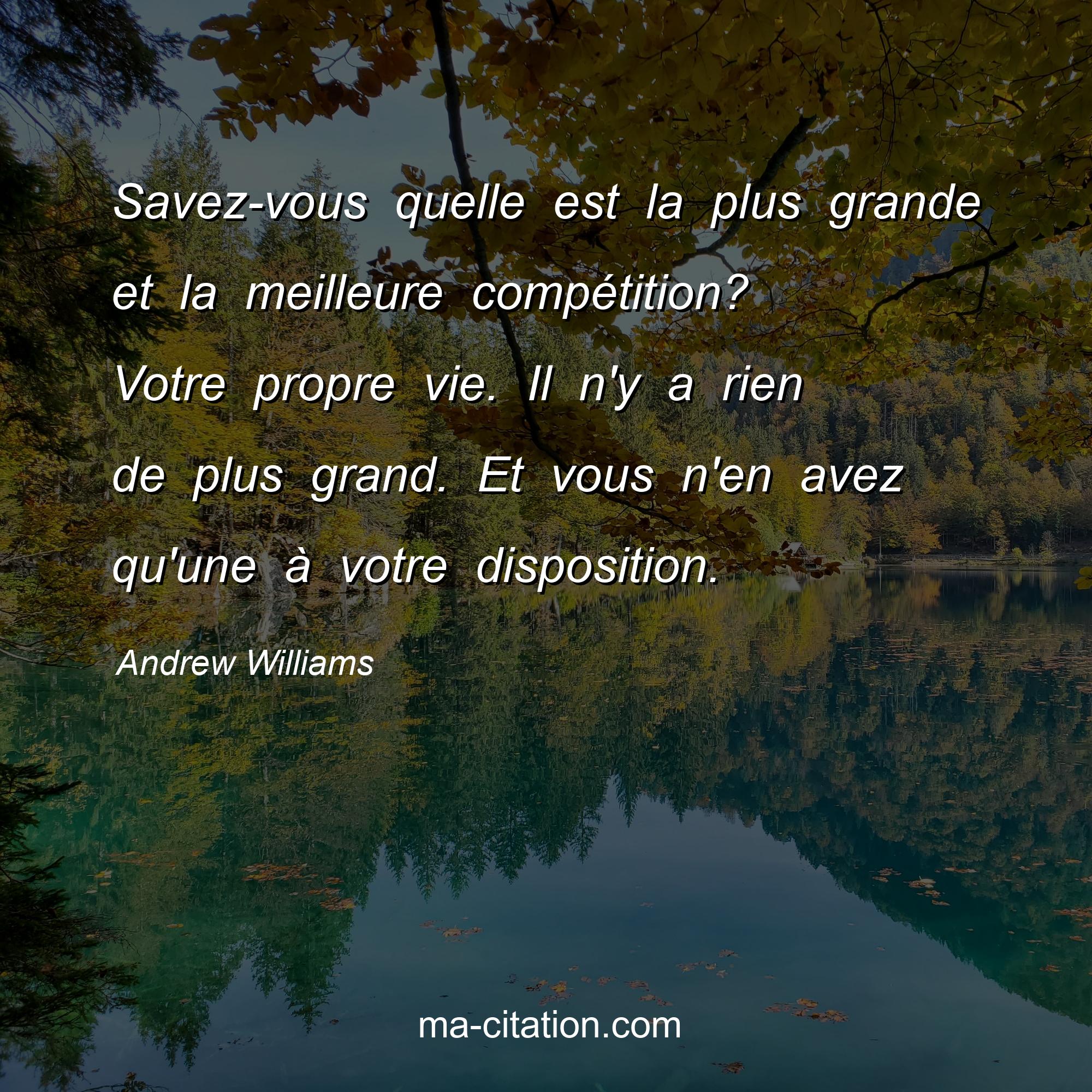 Citation sur la vie d'Andrew Williams :Savez-vous quelle est la plus grande et la meilleure compétition? Votre propre vie. Il n'y a rien de plus grand. Et vous n'en avez qu'une à votre disposition.