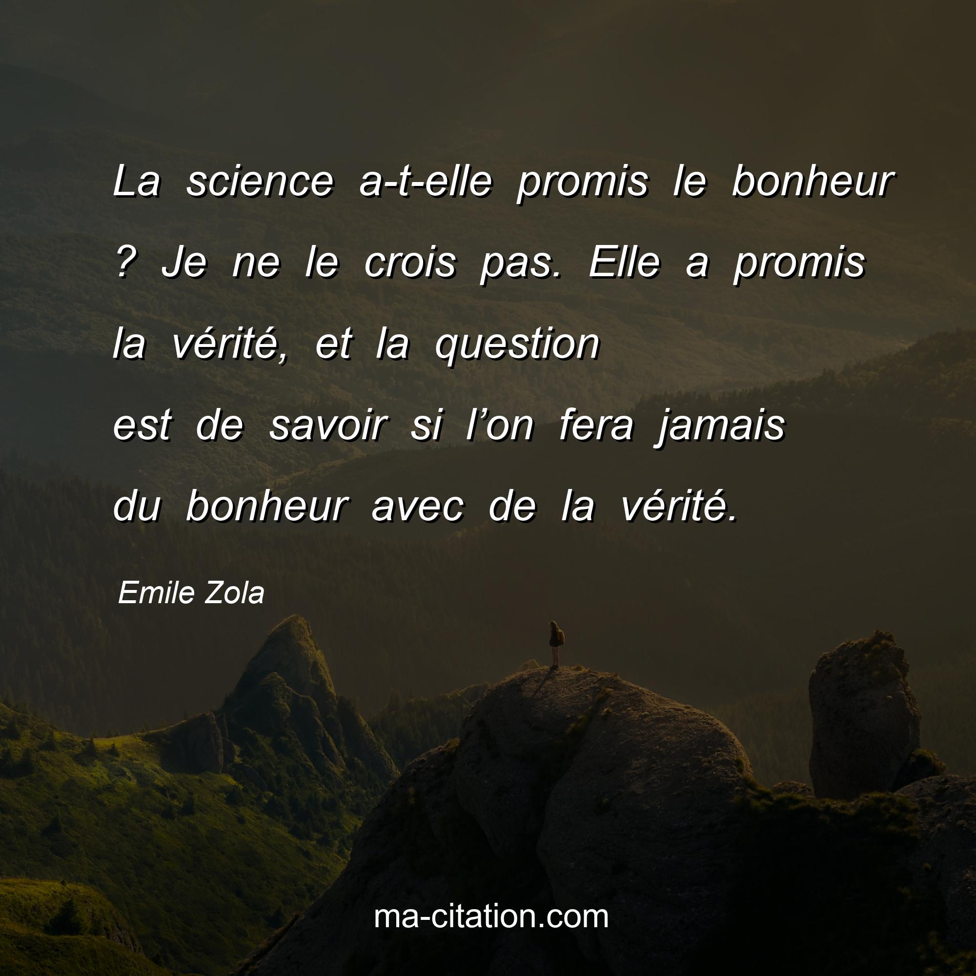 Citation sur la vie d'Emile Zola :La science a-t-elle promis le bonheur ? Je ne le crois pas. Elle a promis la vérité, et la question est de savoir si l’on fera jamais du bonheur avec de la vérité.