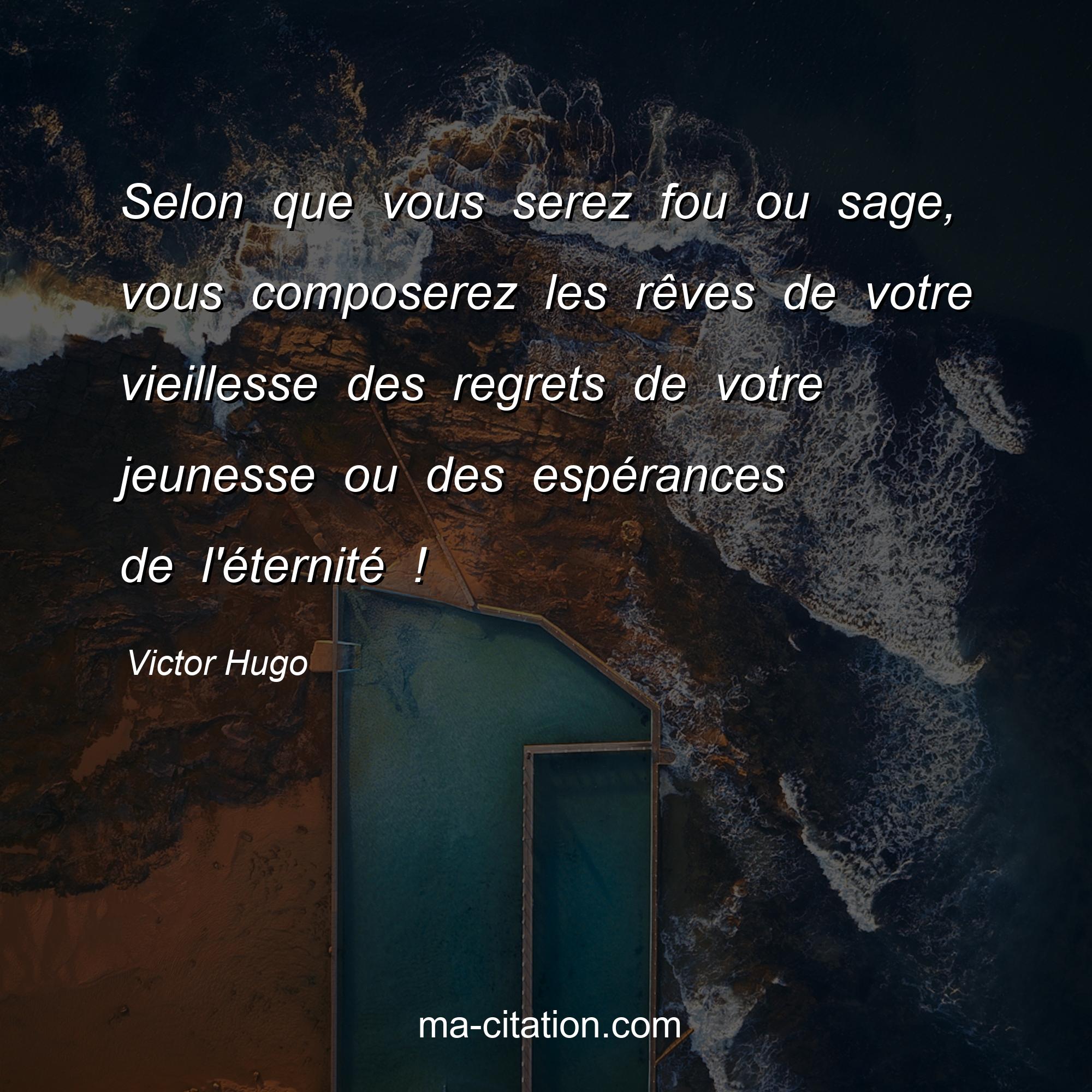 Citation sur la vie de Victor Hugo :Selon que vous serez fou ou sage, vous composerez les rêves de votre vieillesse des regrets de votre jeunesse ou des espérances de l'éternité !