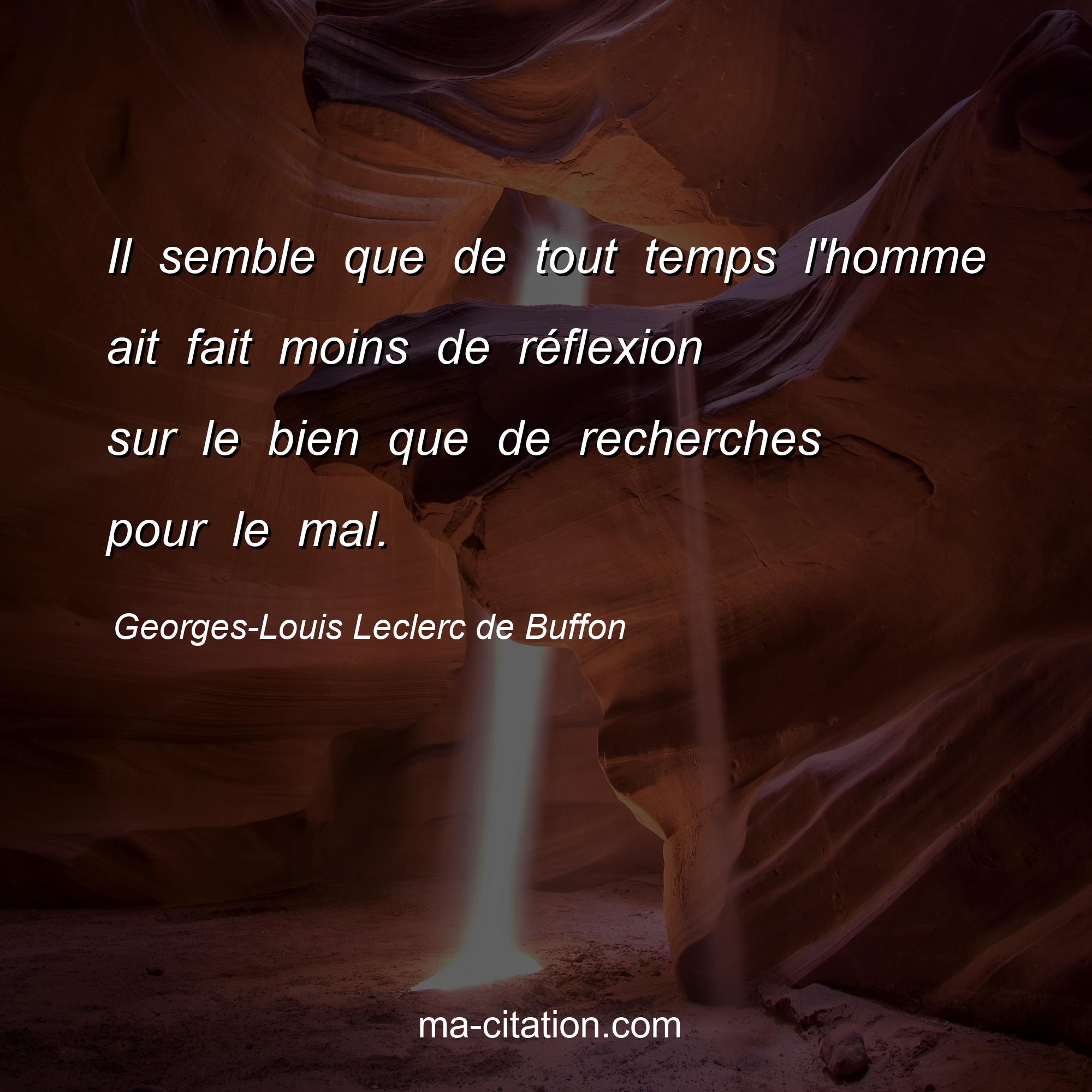 Citation sur la vie de Georges-Louis Leclerc de Buffon :Il semble que de tout temps l'homme ait fait moins de réflexion sur le bien que de recherches pour le mal.
