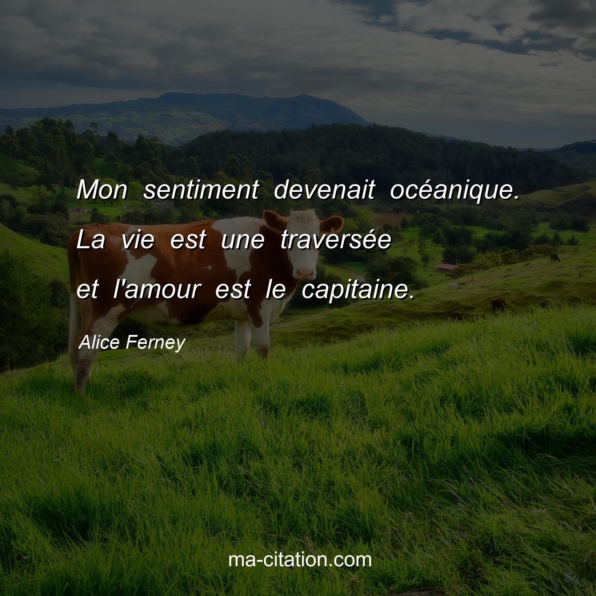 Alice Ferney est l'auteur de la citation sur la vie "Mon sentiment devenait océanique. La vie est une traversée et l'amour est le capitaine.".