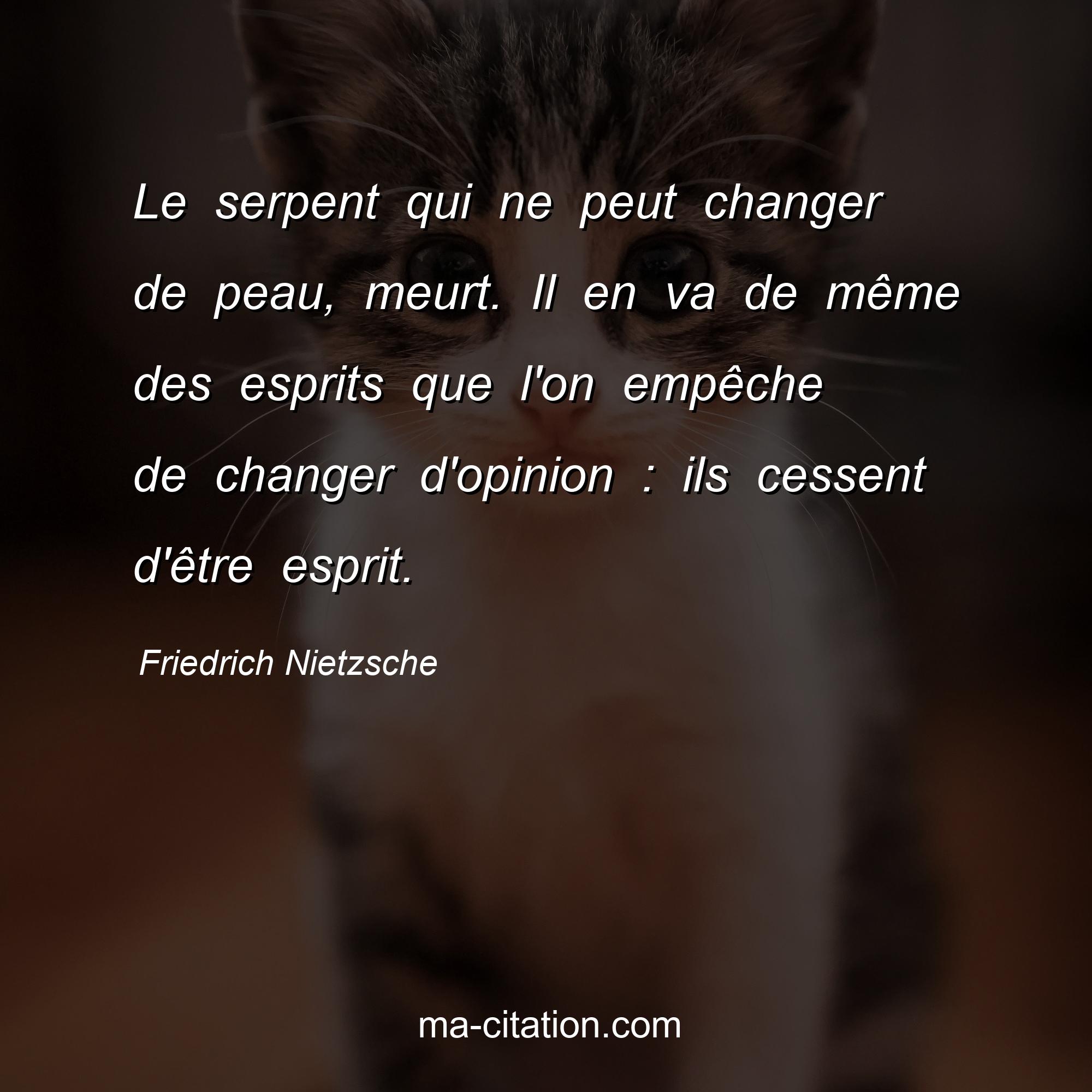 Citation sur la vie de Friedrich Nietzsche :Le serpent qui ne peut changer de peau, meurt. Il en va de même des esprits que l'on empêche de changer d'opinion : ils cessent d'être esprit.