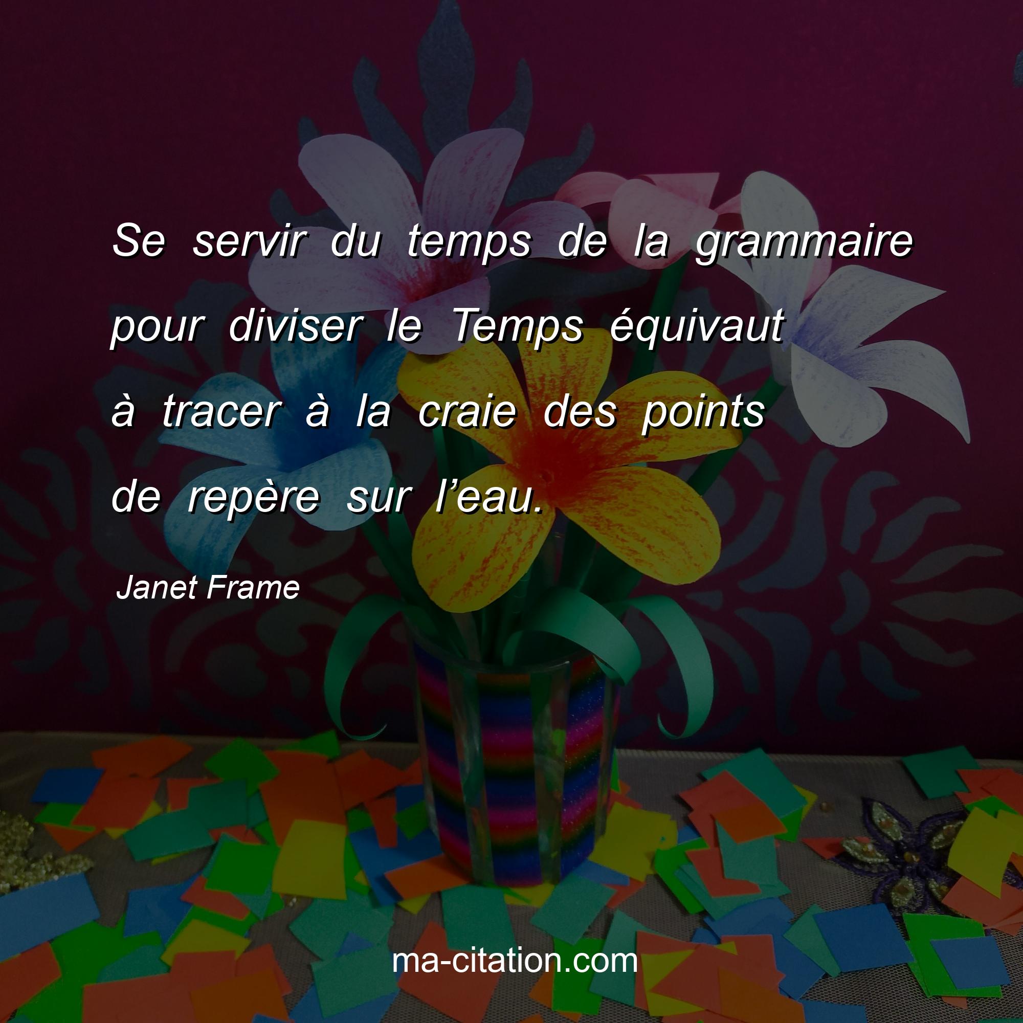 Citation sur la vie de Janet Frame :Se servir du temps de la grammaire pour diviser le Temps équivaut à tracer à la craie des points de repère sur l’eau.
