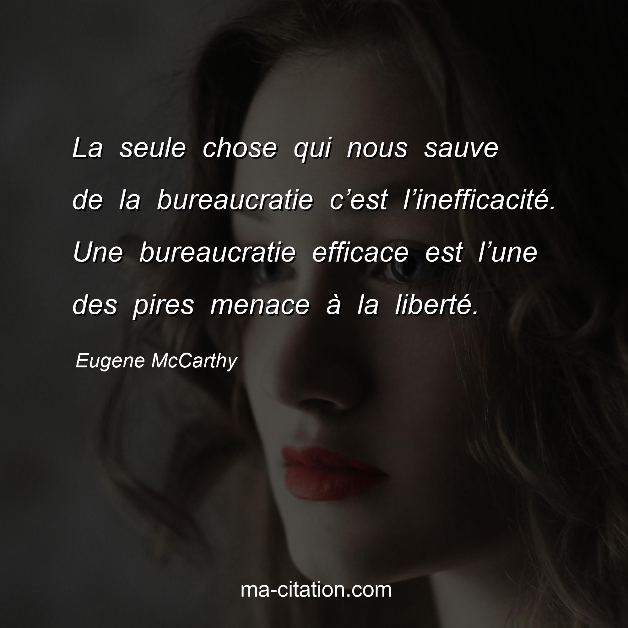 Citation sur la vie d'Eugene McCarthy :La seule chose qui nous sauve de la bureaucratie c’est l’inefficacité. Une bureaucratie efficace est l’une des pires menace à la liberté.