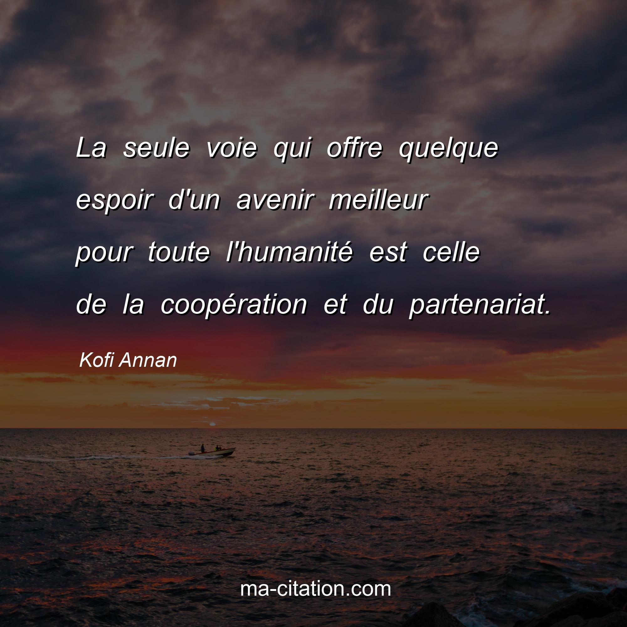 Kofi Annan est l'auteur de la citation sur la vie "La seule voie qui offre quelque espoir d'un avenir meilleur pour toute l'humanité est celle de la coopération et du partenariat.".