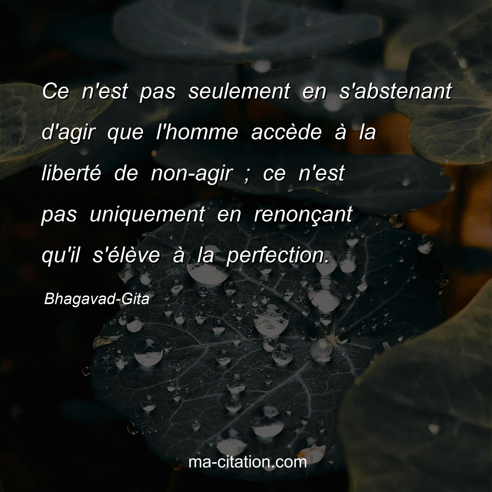 Bhagavad-Gita est l'auteur de la citation sur la vie "Ce n'est pas seulement en s'abstenant d'agir que l'homme accède à la liberté de non-agir ; ce n'est pas uniquement en renonçant qu'il s'élève à la perfection.".