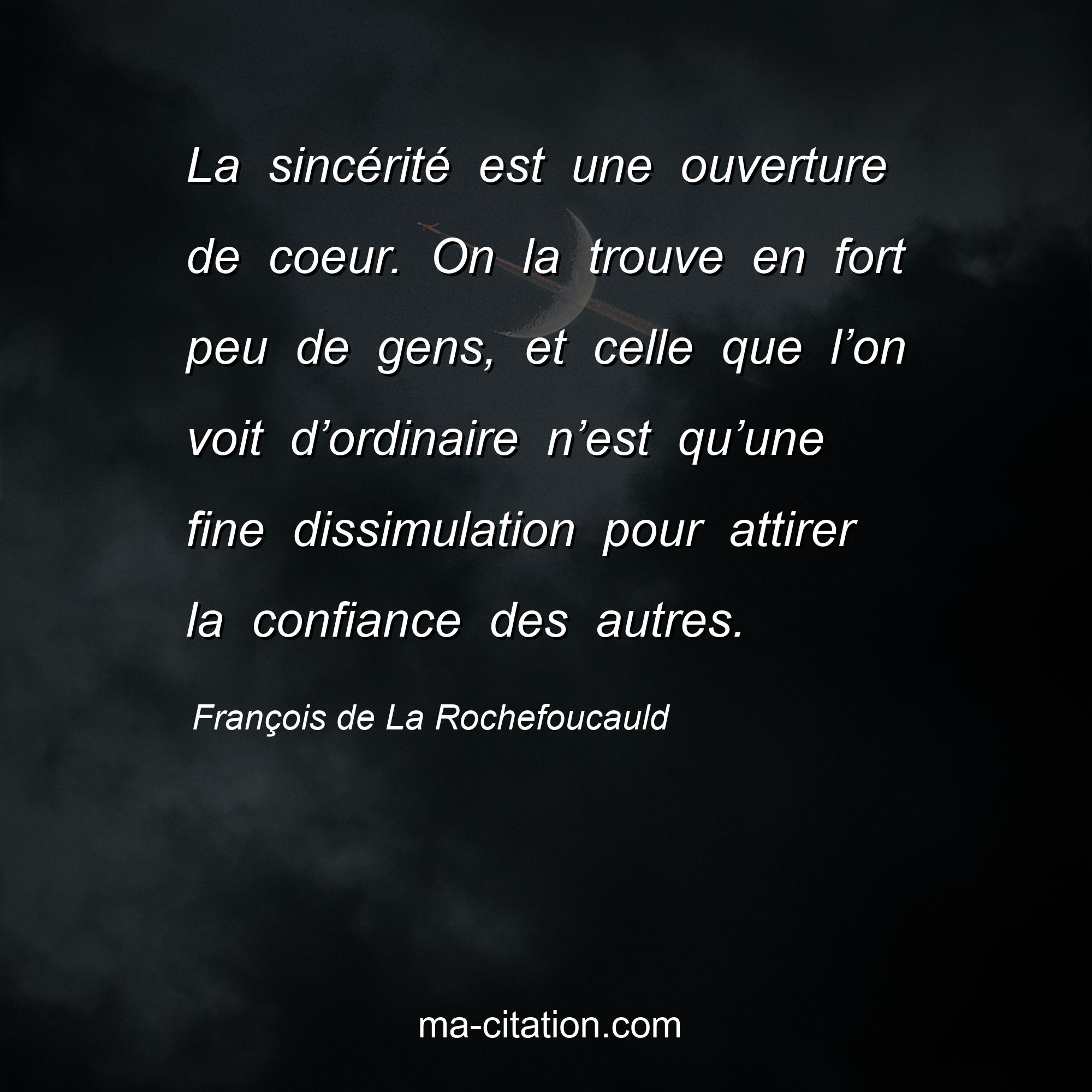 Citation sur la vie de François de La Rochefoucauld :La sincérité est une ouverture de coeur. On la trouve en fort peu de gens, et celle que l’on voit d’ordinaire n’est qu’une fine dissimulation pour attirer la confiance des autres.