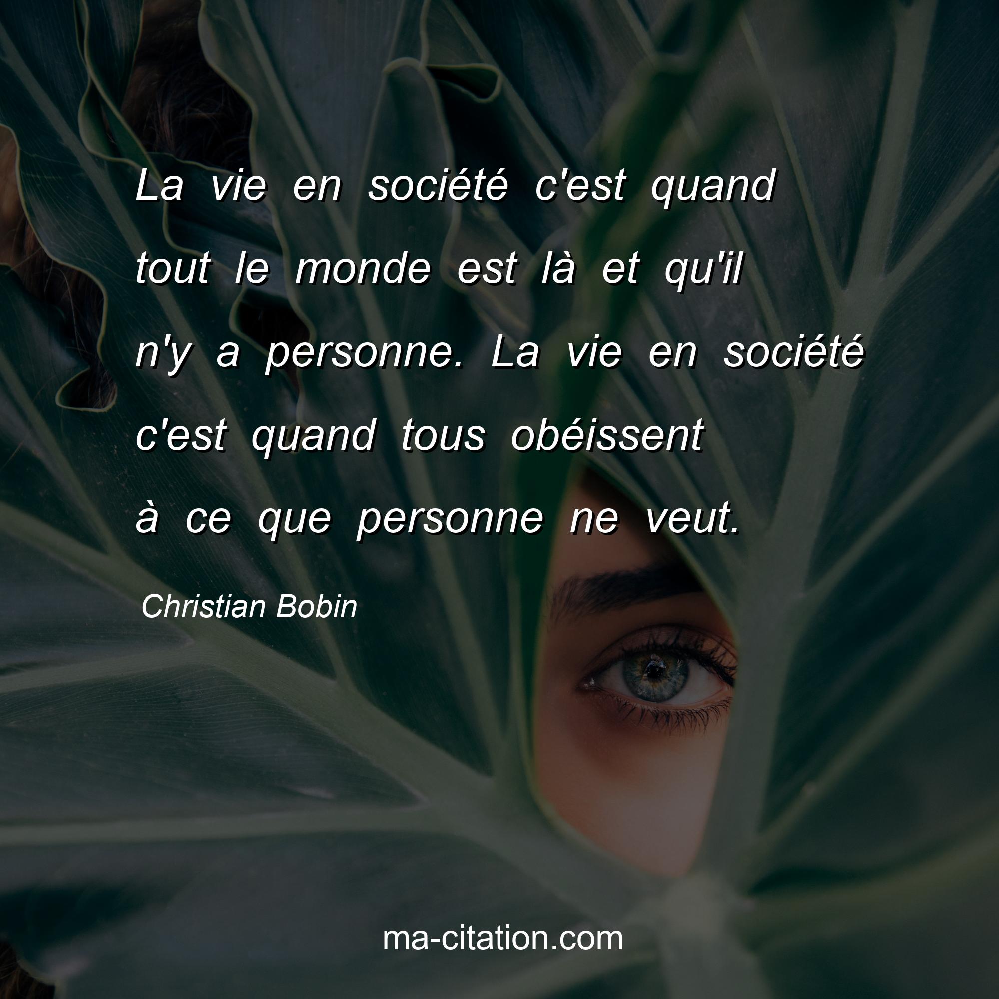 Citation sur la vie de Christian Bobin :La vie en société c'est quand tout le monde est là et qu'il n'y a personne. La vie en société c'est quand tous obéissent à ce que personne ne veut.